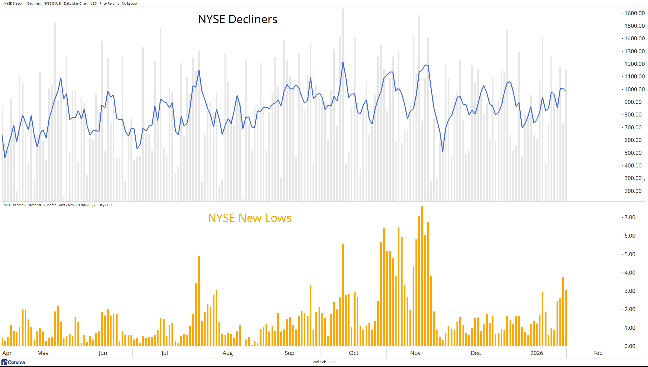 The market isn’t breaking—but it is quietly changing its character. New highs at the index level mask increasing participation from defensive areas, a slow creep higher in decliners, and expanding new lows beneath the surface. None of this is decisive on its own, but together it’s enough to warrant attention.