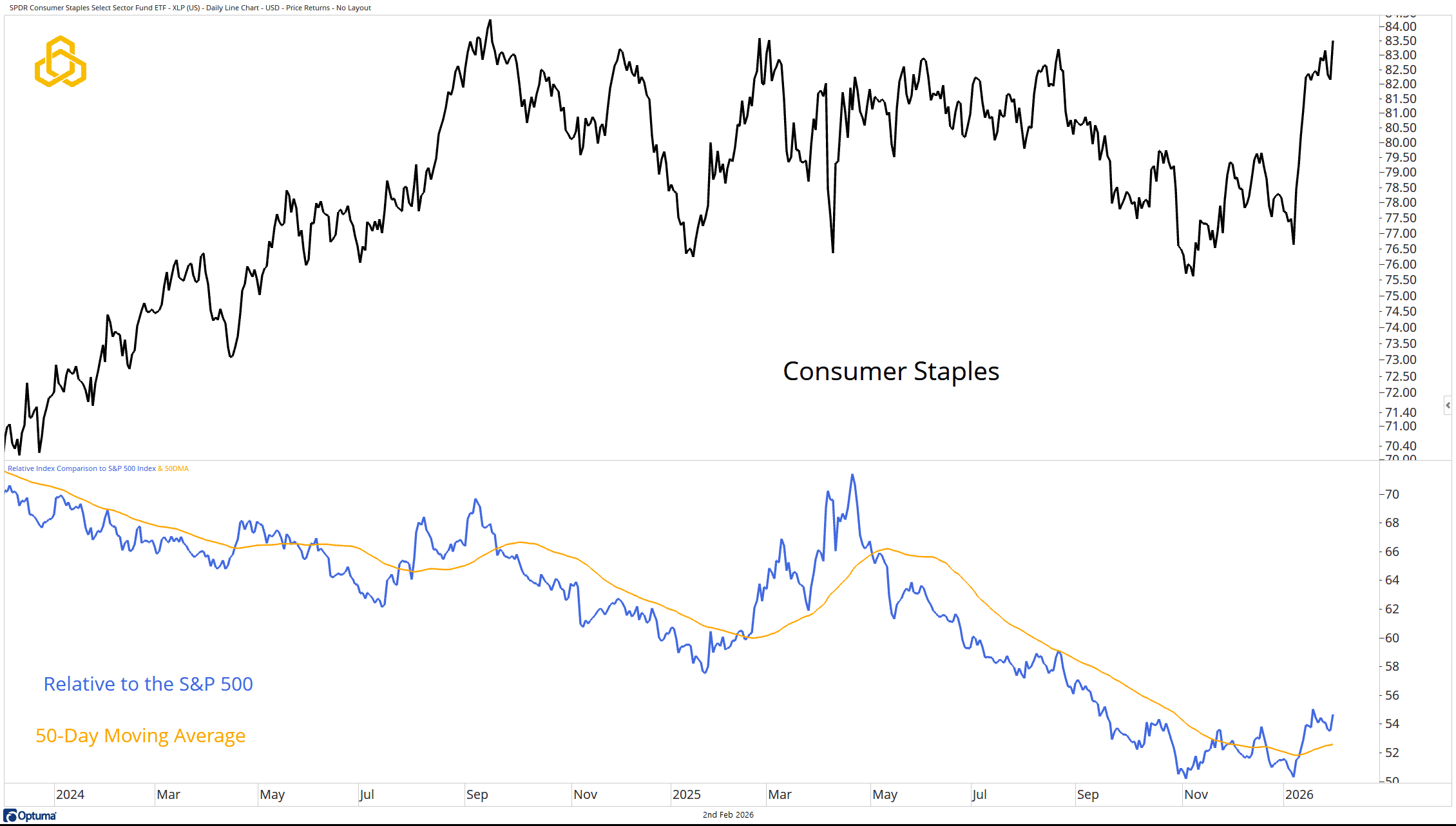 Notably, the relative ratio has reclaimed its 50day moving average after successfully holding the November 2025 lows. And let’s be clear—Staples are not typically known as the “offensive” players in the market.