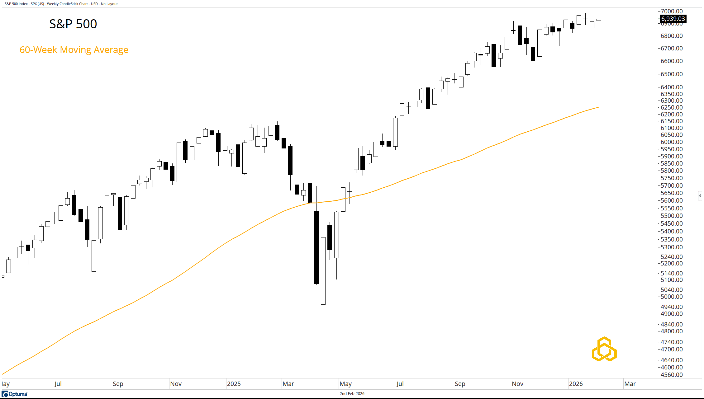 Ideally, we like to see breakouts stick—but the fade that followed wasn’t particularly damaging either. The index remains well above the 60-week moving average.