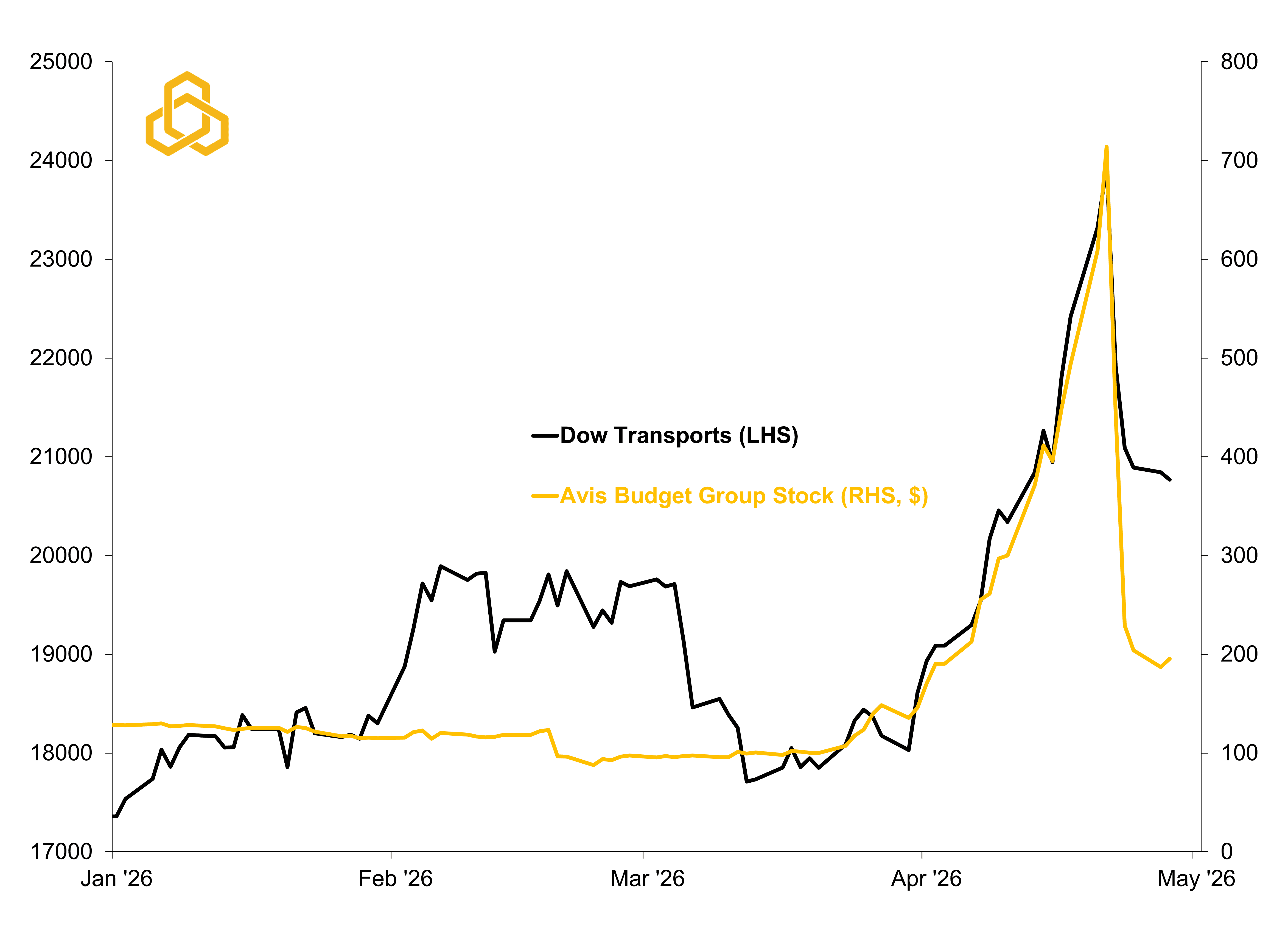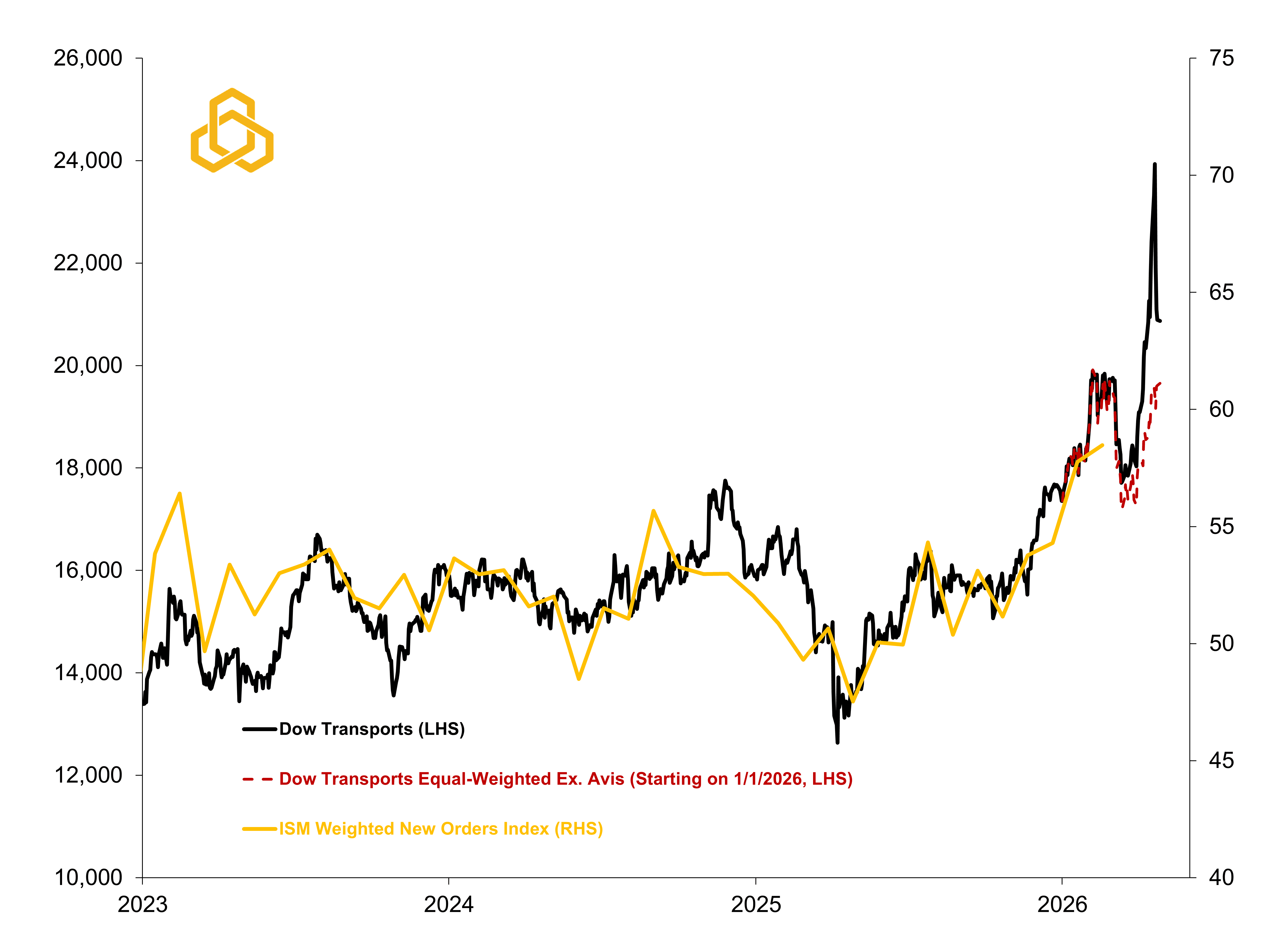 To adjust for the recent surge, we created an equal-weighted Dow Transports index excluding Avis Budget Group. Unsurprisingly, much of the spike and collapse fades away, with the index showing a V-shaped recovery from the recent pullback following the onset of the U.S. / Israel / Iran conflict. It also suggests that new orders likely remained fairly stable in April, with the next releases due on May 1st for manufacturing and May 5th for services.