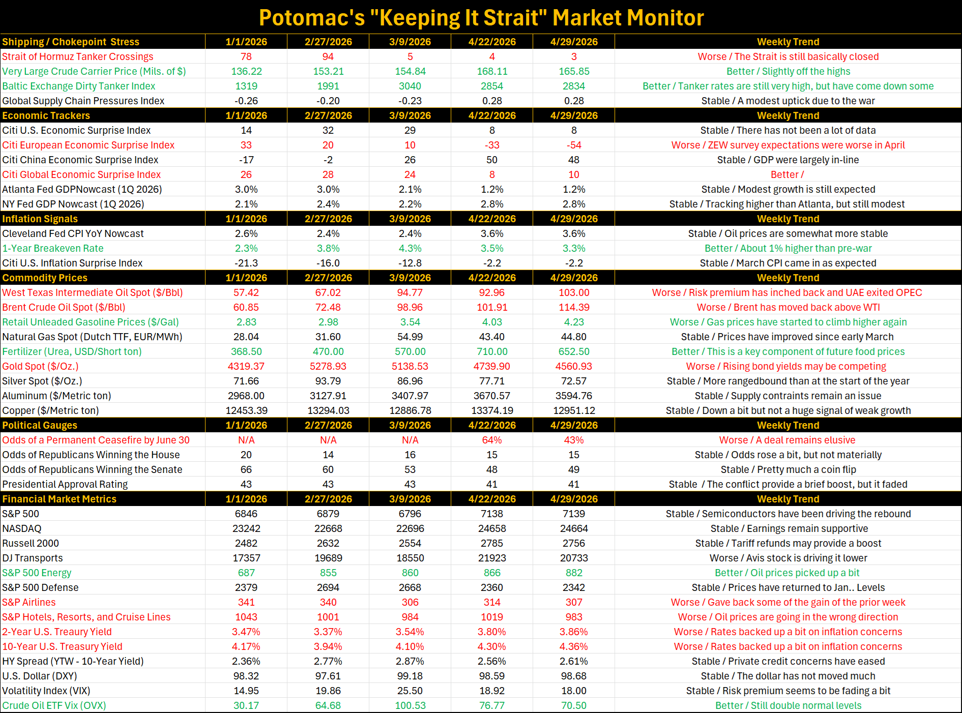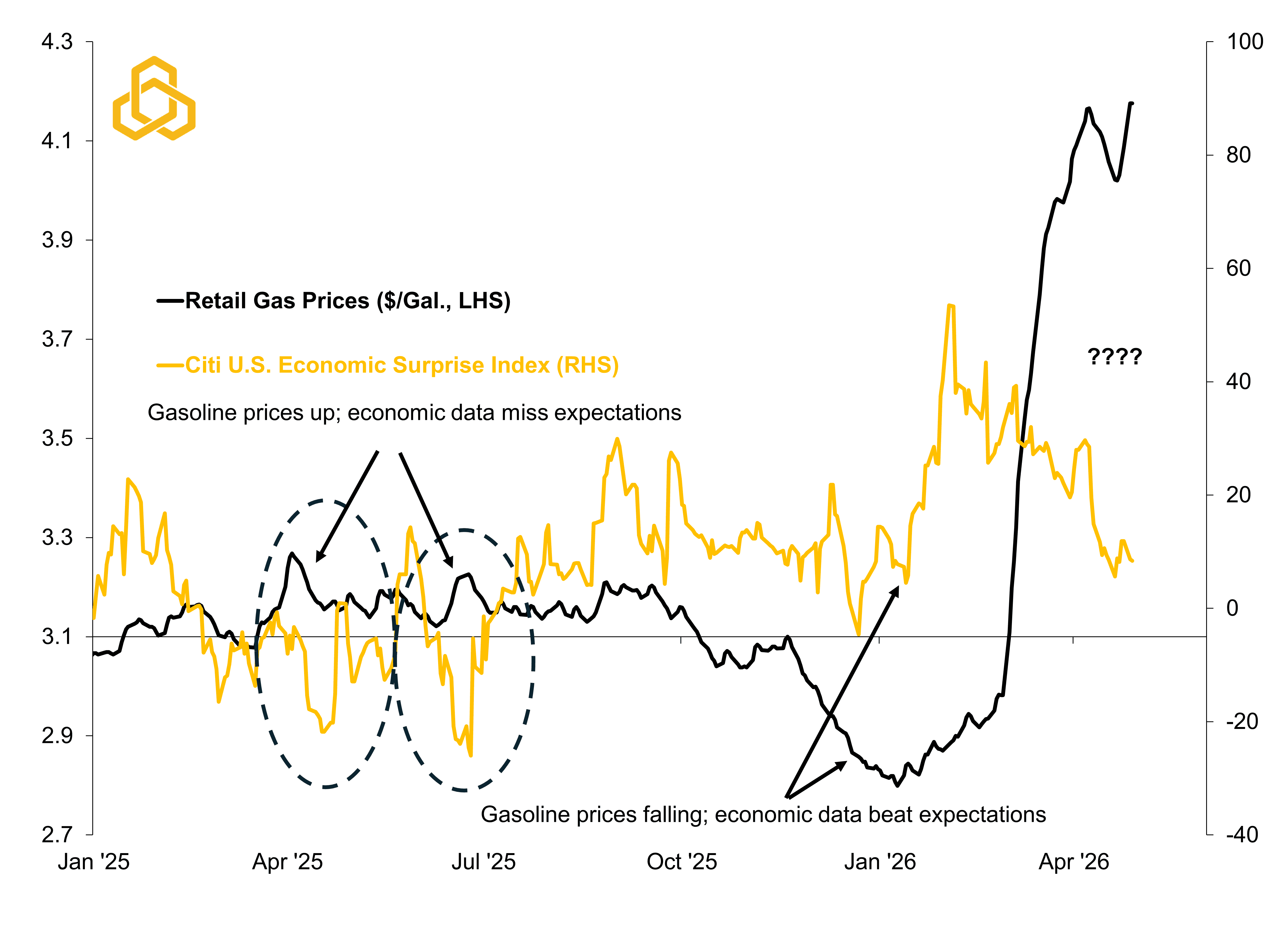 Sources: American Automobile Association, Citigroup Global Markets, Inc., Bloomberg L.P., and Potomac. Data as of April 28, 2026. Note: A Citi Economic Surprise Index reading above zero means that economic data are beating consensus on average; below means that data are missing expectations.