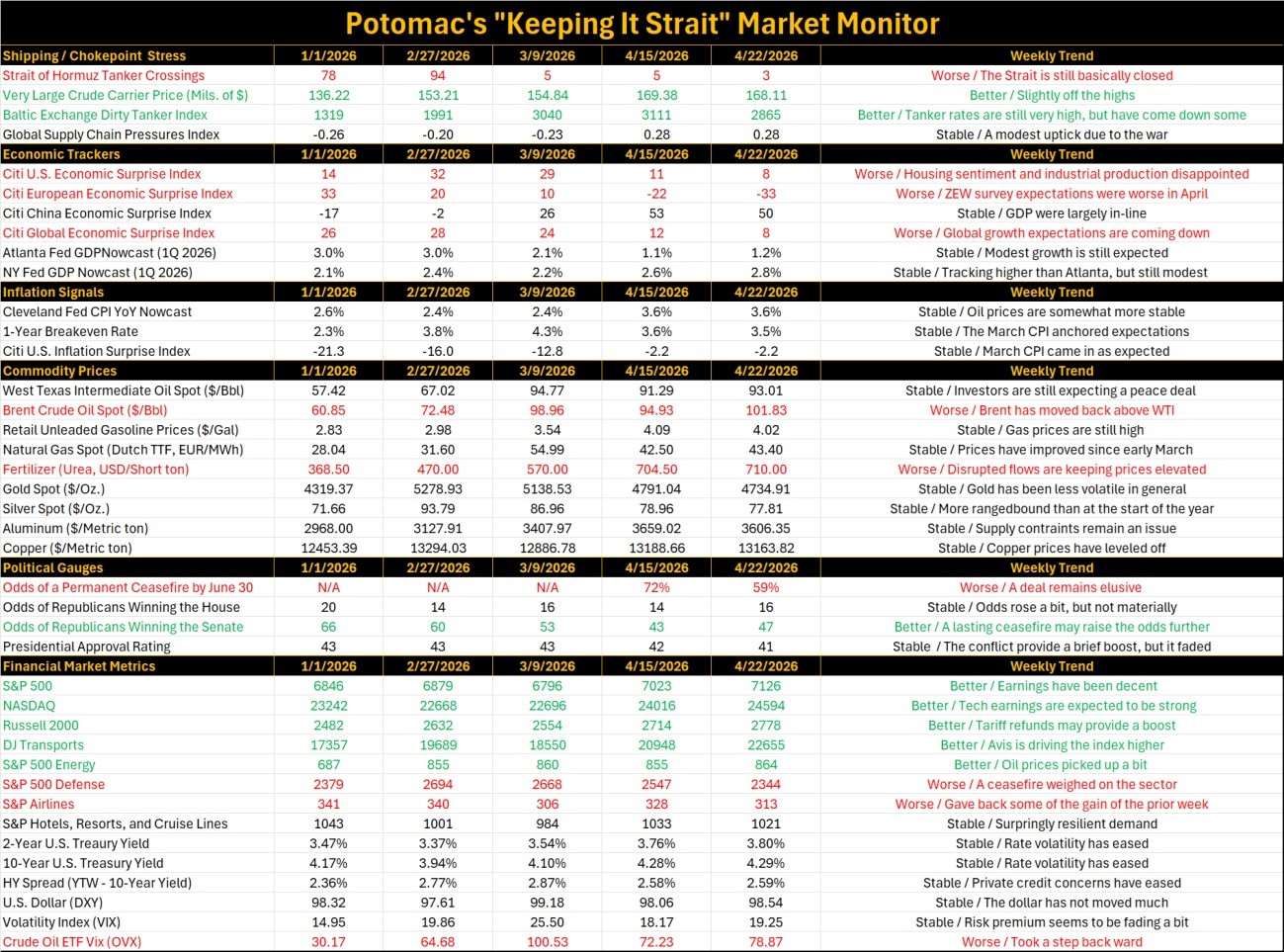 Source: Bloomberg L.P. and Potomac. Data as of April 22, 2026. Note 1: The dates selected are 2/27/2026 (start of the conflict), 3/9/2026 (initial oil surge/peak as the Strait closed), and the latest week and previous week to compare the weekly trend. Note 2: Economic and inflation surprise index readings about zero imply that data are beating the consensus on average, below zero means that data are missing expectations. Note 3: In commodity prices, we ranked higher oil, natural gas, retail gas, fertilizer, and aluminum prices as bad for the economy because it weighs on growth, we ranked rising gold and silver prices are good due to the investor perspective. Note 4: Political betting market odds are forecasts. All forecasts are expressions of opinions and are subject to change without notice and are not intended to be a guarantee.