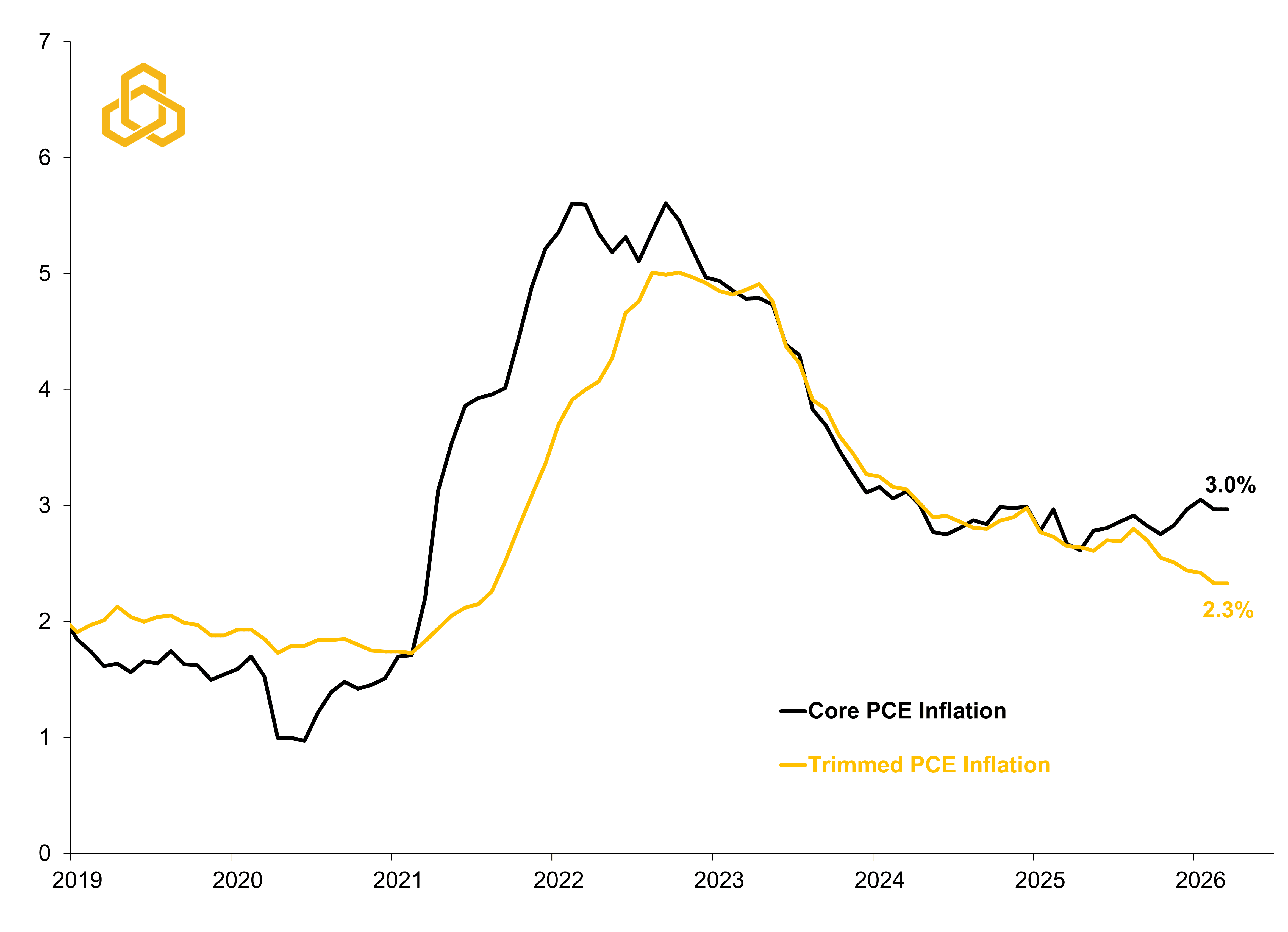 Sources: Bureau of Economic Analysis, Federal Reserve Bank of Dallas, Bloomberg L.P., and Potomac. Data as of March 2026. Note 1: Core PCE is the personal consumption expenditure chained price index, excluding food and energy and is a measure of inflation that the Fed follows closely instead of the consumer price index (or CPI). Note 2: The trimmed PCE metric removes the largest price increases and decreases across all categories and can be viewed as a cleaner signal of inflation.