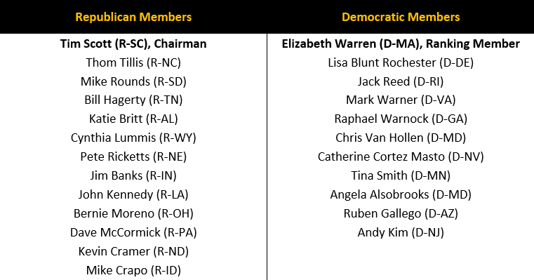 Sources: United States Committee on Banking, Housing, and Urban Affairs. Date as of April 21, 2026.