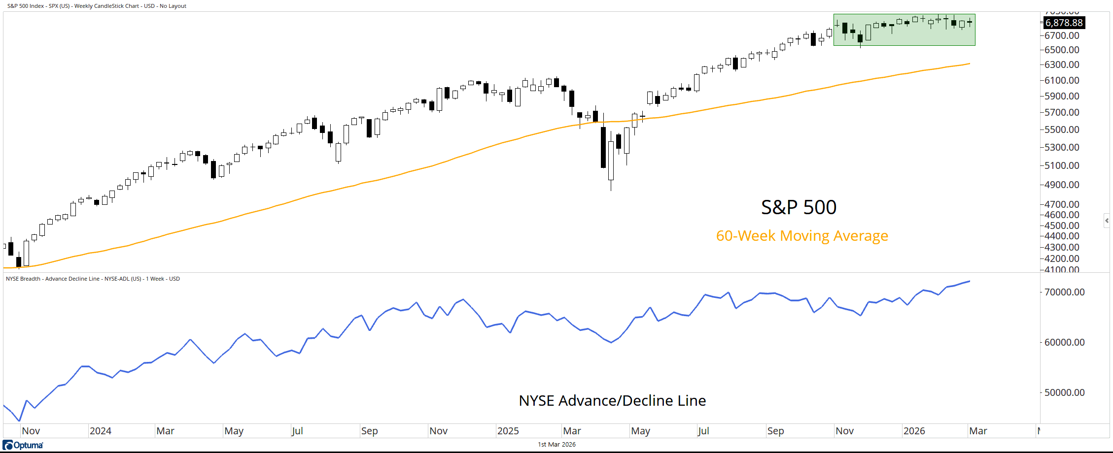 As we’ve noted, the S&P 500 has made little progress since the week of Halloween 2025. That’s perfectly normal following a strong advance like the one off the April 2025 lows. Perhaps the index is simply giving its rising 60-week moving average time to catch up.