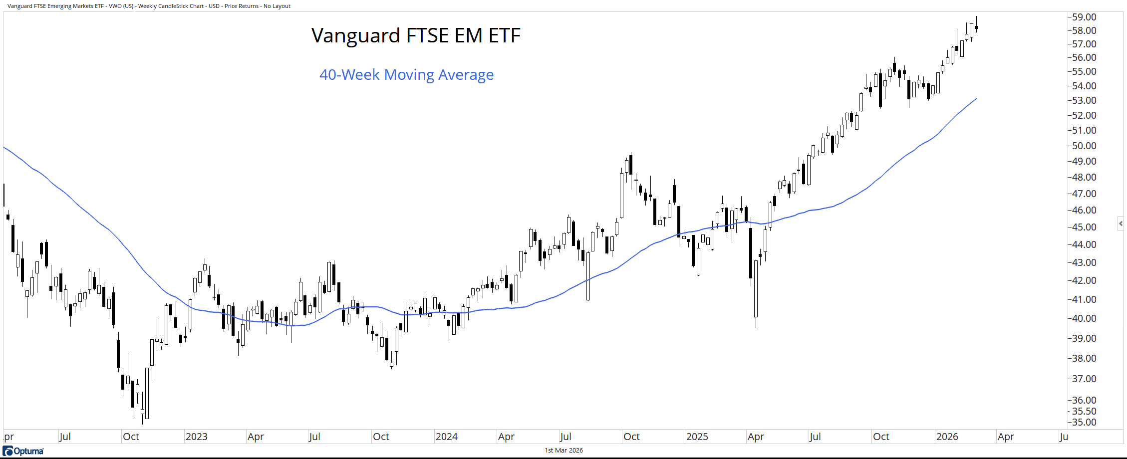 While we’ve focused heavily on developed international markets, Emerging Markets also deserve attention. The Vanguard FTSE Emerging Markets ETF (VWO) traded at a new high last week and remains well above its rising 40-week moving average.