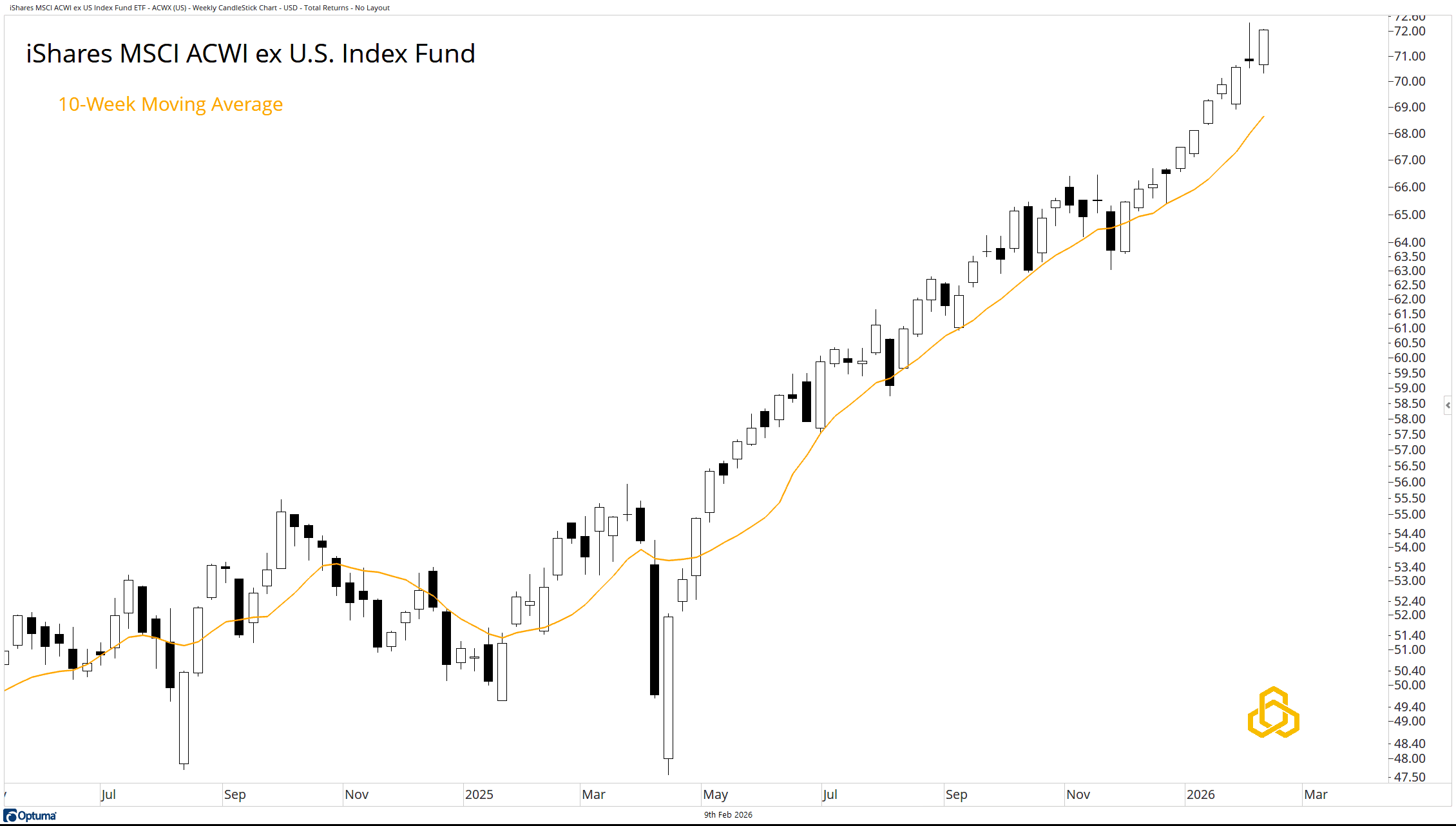 Let’s not forget the support coming from international markets. The iShares MSCI ACWI ex U.S. Index Fund put in a strong rebound above its rising 10 week moving average.