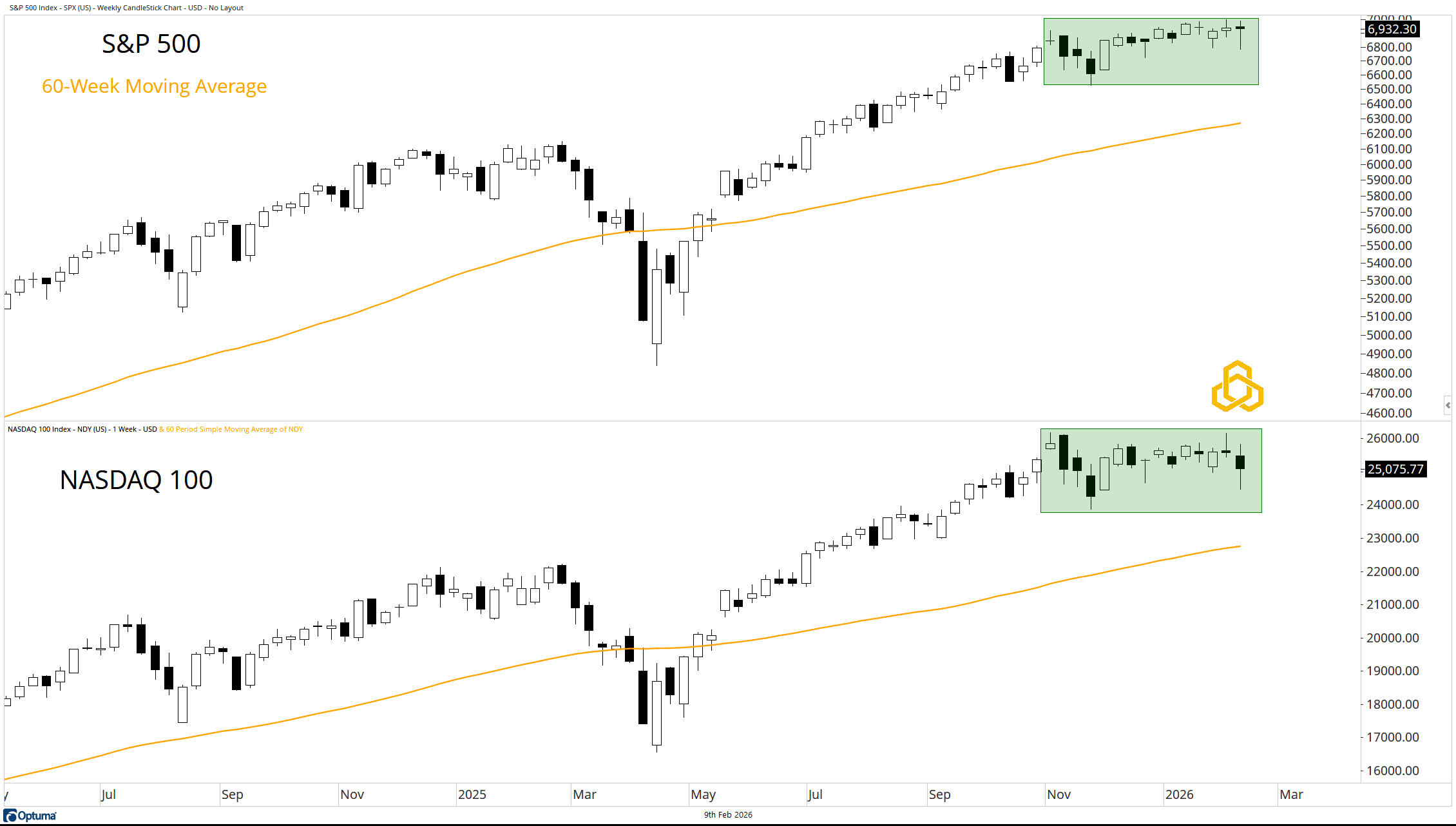 The S&P 500 and the NASDAQ 100 remain above their respective 60-week moving averages. However, neither index has made meaningful progress since October 2025.