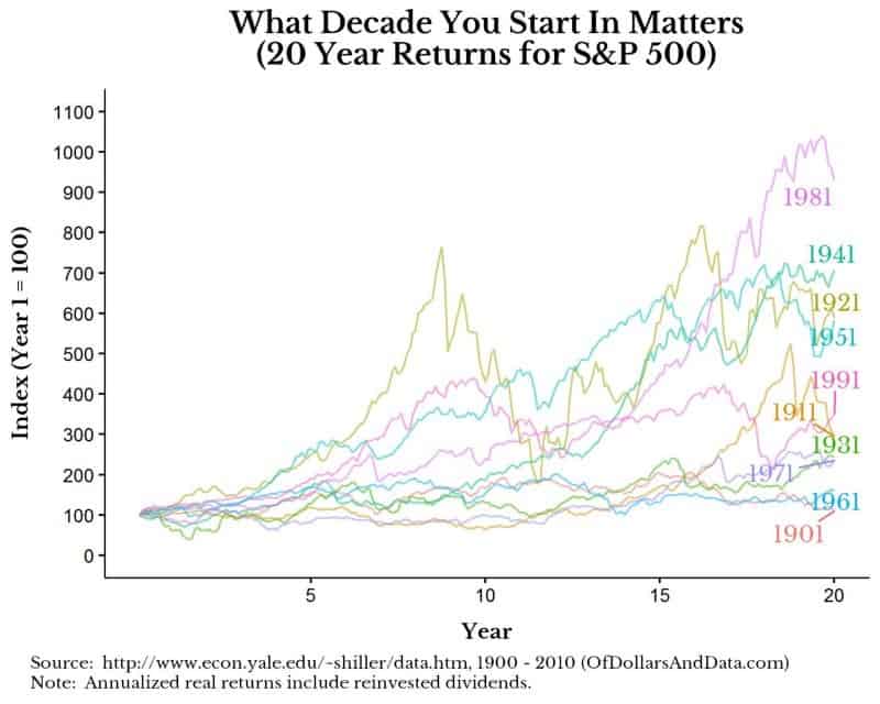 Different investors will have different experiences in the markets, depending on when they start investing. This idea was illustrated well in a recent article from "On Dollars and Data", which examined total returns for stocks and a blended stock/bond portfolio over different 20- and 40-year periods. As one example, the chart below shows how 20-year returns for the S&P 500 diverged significantly over different decades, starting in 1901.