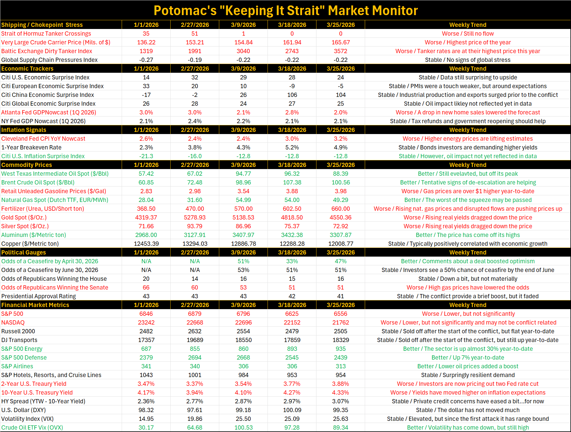 Source: Bloomberg L.P. and Potomac. Data as of March 25, 2026. Note 1: The dates selected are 2/27/2026 (start of the conflict), 3/9/2026 (initial oil surge/peak as the Strait closed), and the latest week and previous week to compare the weekly trend. Note 2: Economic and inflation surprise index readings about zero imply that data are beating the consensus on average, below zero means that data are missing expectations. Note 3: In commodity prices, we ranked higher oil, natural gas, retail gas, fertilizer, and aluminum prices as bad for the economy because it weighs on growth, we ranked rising gold and silver prices are good due to the investor perspective. Note 4: Political betting market odds are forecasts. All forecasts are expressions of opinions and are subject to change without notice and are not intended to be a guarantee.