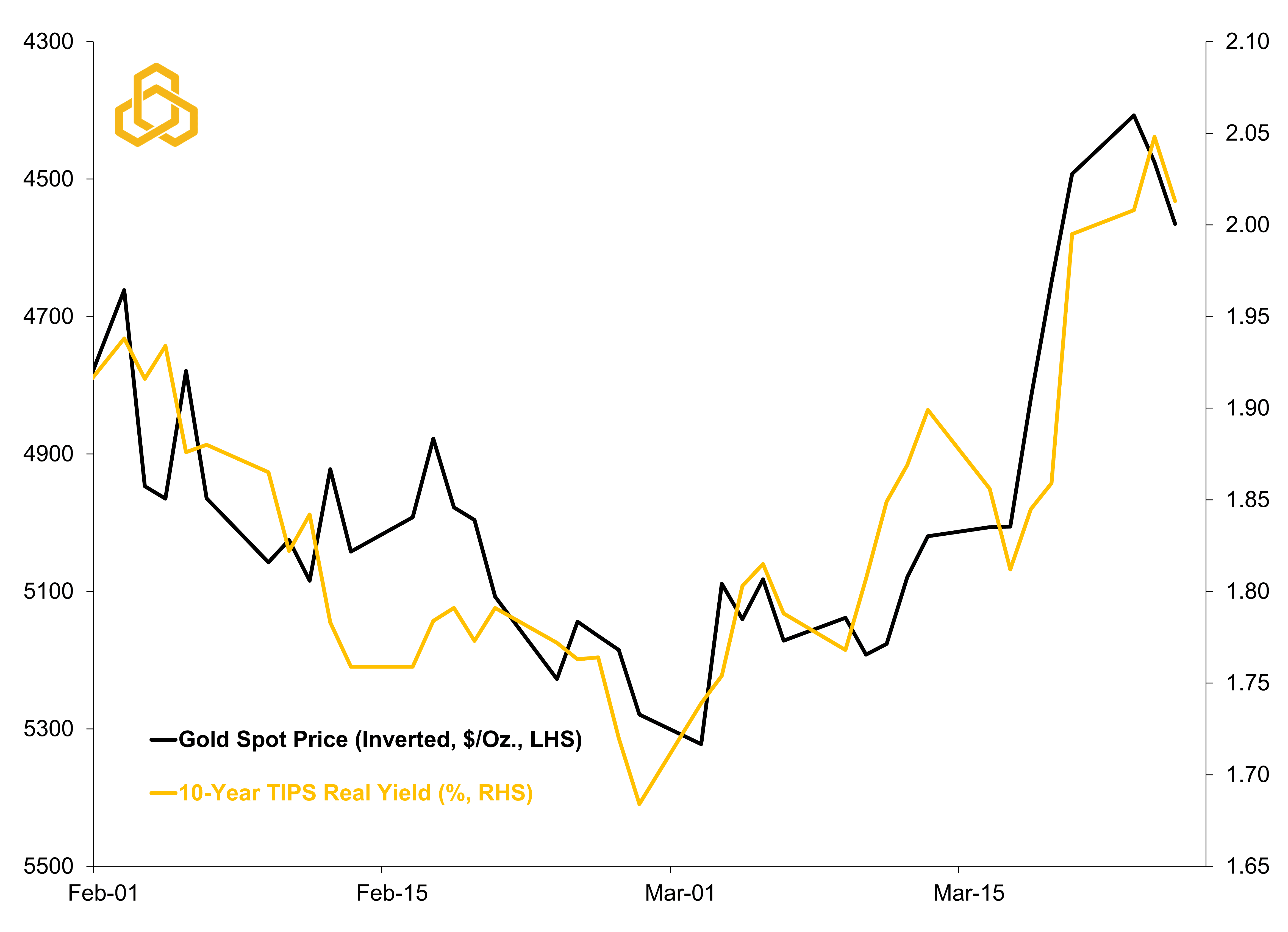 Gold is a non-yielding asset. While rising inflation expectations would normally increase the appeal of holding gold, the path for monetary policy is highly uncertain right now and that is reducing the desire to hold non-interest-bearing assets like gold. This relationship broke down in mid-2023 as central banks ramped up gold purchases, but it appears to be reasserting itself following the recent surge in real yields (see figure 2).