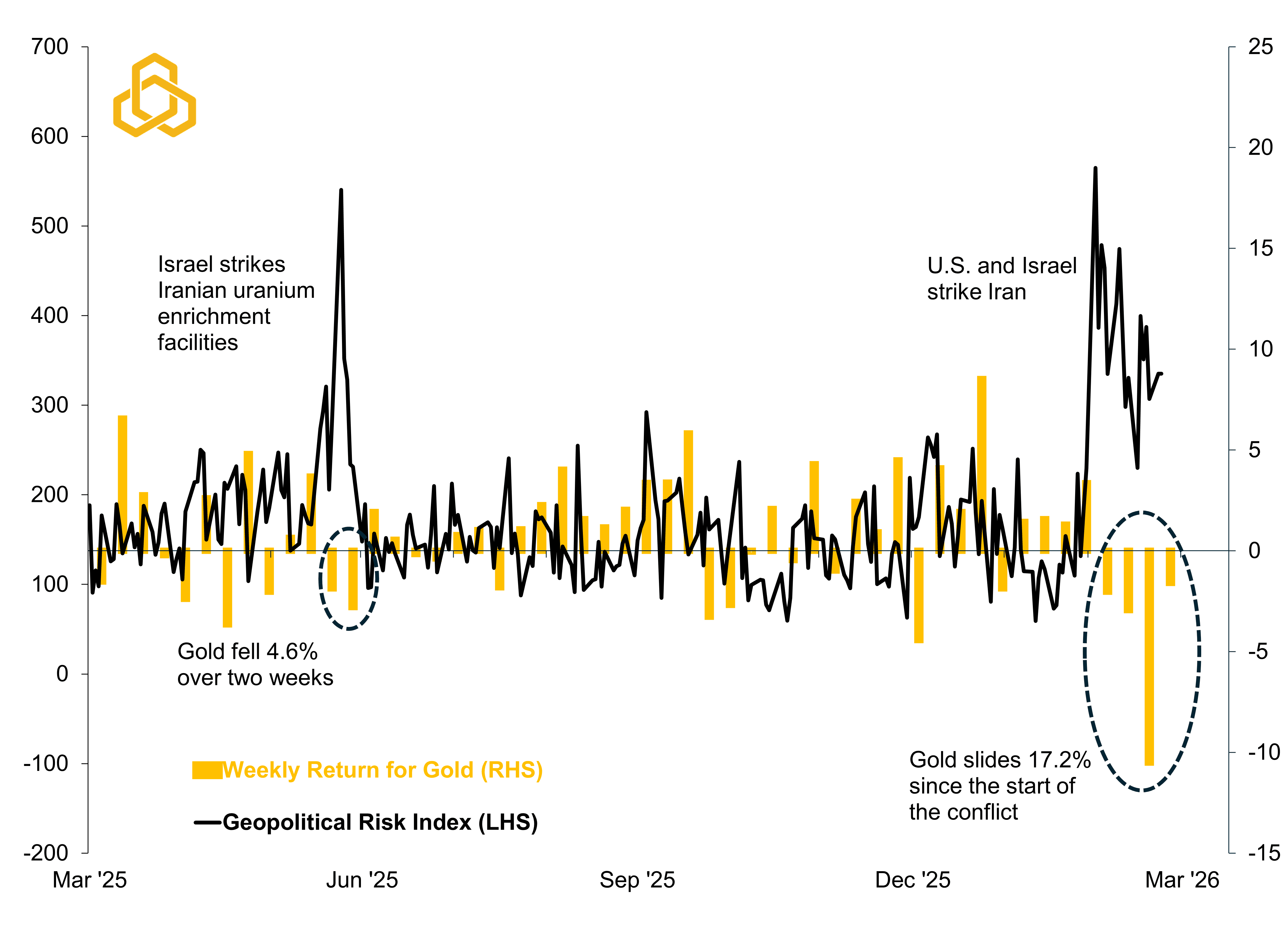 Gold prices have tumbled 17.2% since March 2nd while geopolitical tensions in the Middle East continue to simmer with strikes on oil infrastructure becoming an increasing threat should talks fail (see figure 1). Why isn’t the safe-haven working?