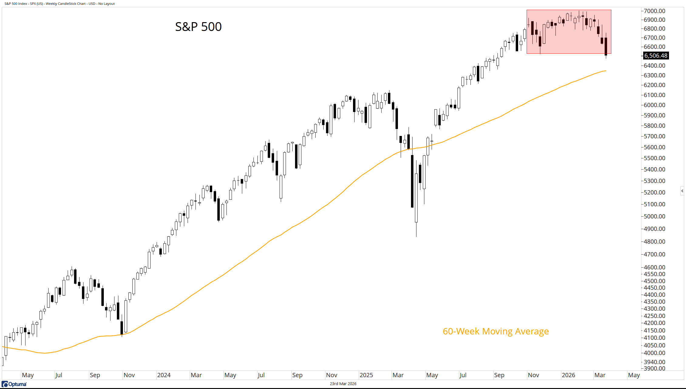 The S&P 500 is now on a four-week losing streak. At the same time, it has fallen out of the consolidation zone we’ve been highlighting in this note. The next key marker in our work is the 60-week moving average. A meaningful break below this measure of trend would signal a major regime shift.