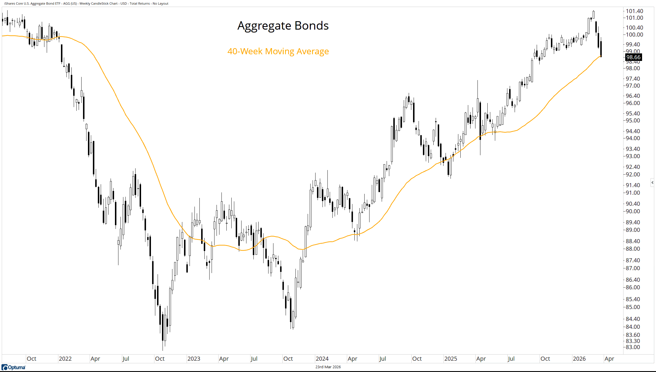We’ve argued for four years that bonds may no longer play that role in strategic portfolios, and we stand by that view. Notably, AGG is now testing its 40-week moving average.
