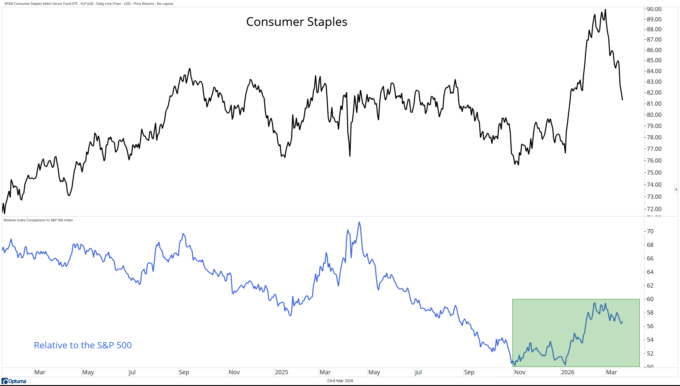 Within equities, Consumer Staples are typically viewed as a haven. Companies that sell what you need rather than what you want tend to perform well in times of uncertainty. However, they have not been immune to the recent selling pressure.
