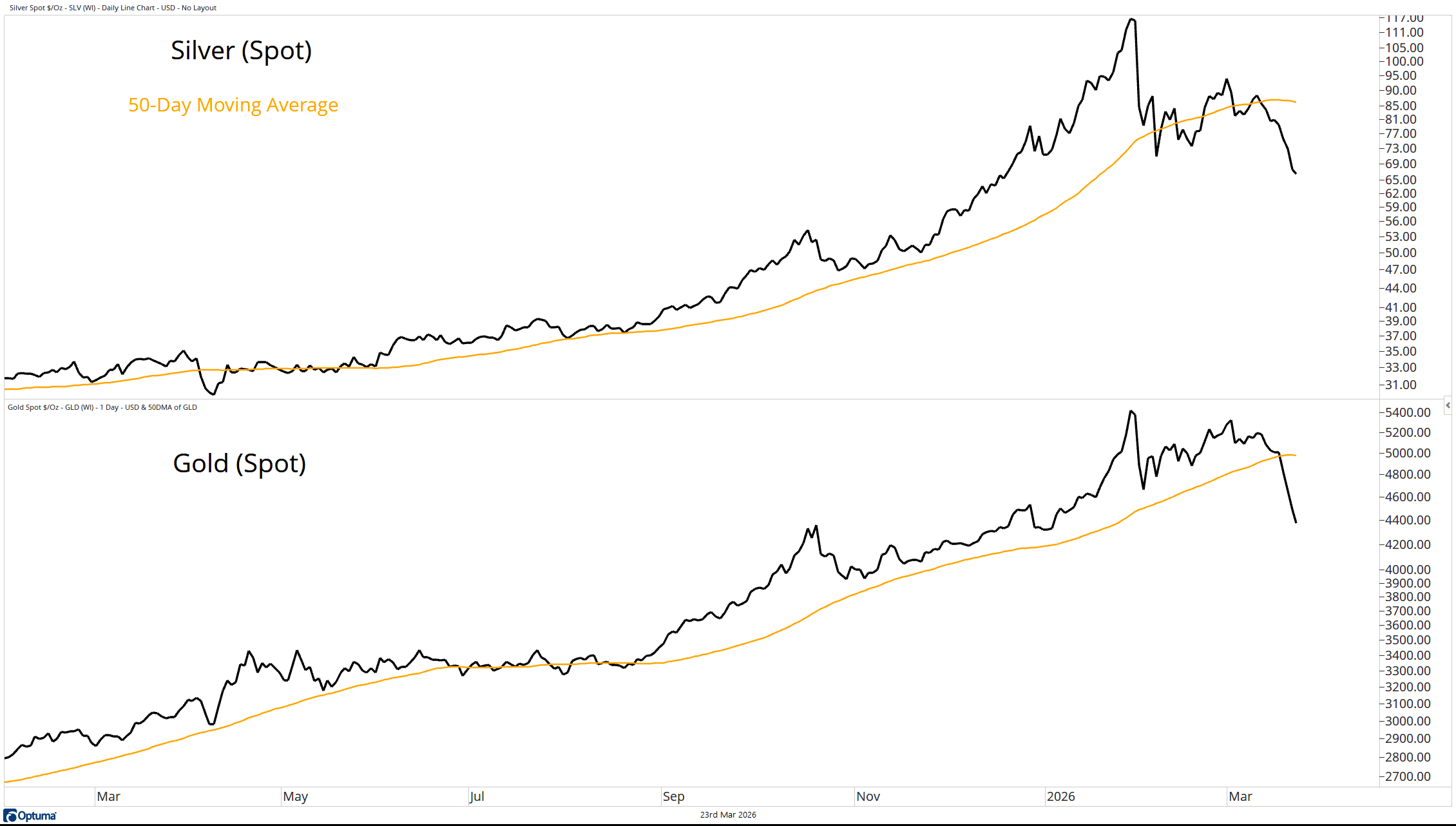 Precious metals had been on an impressive run, but even they are no longer providing shelter. Both silver and gold have decisively lost their 50-day moving averages and are no longer acting as diversifiers to equity exposure.