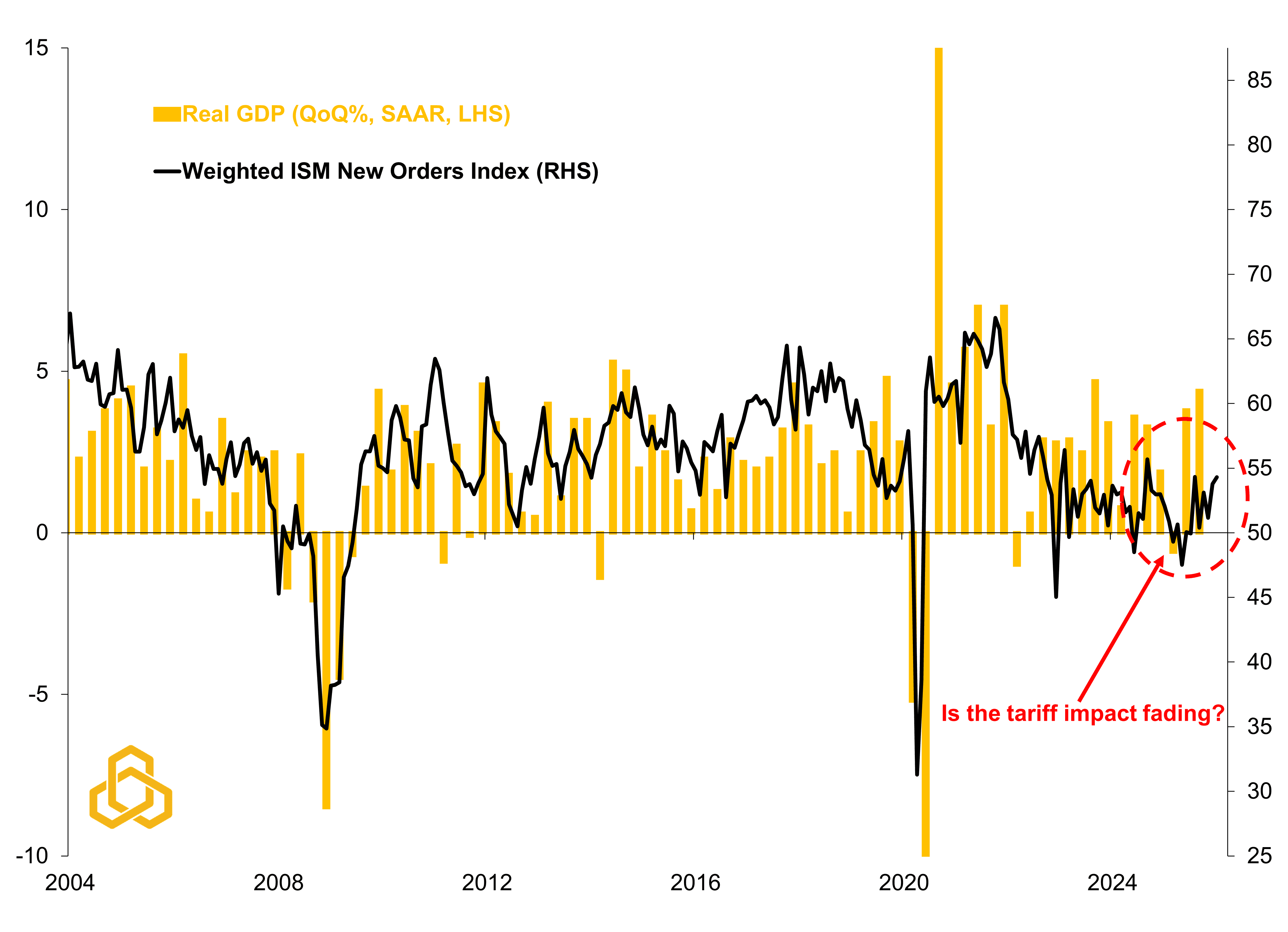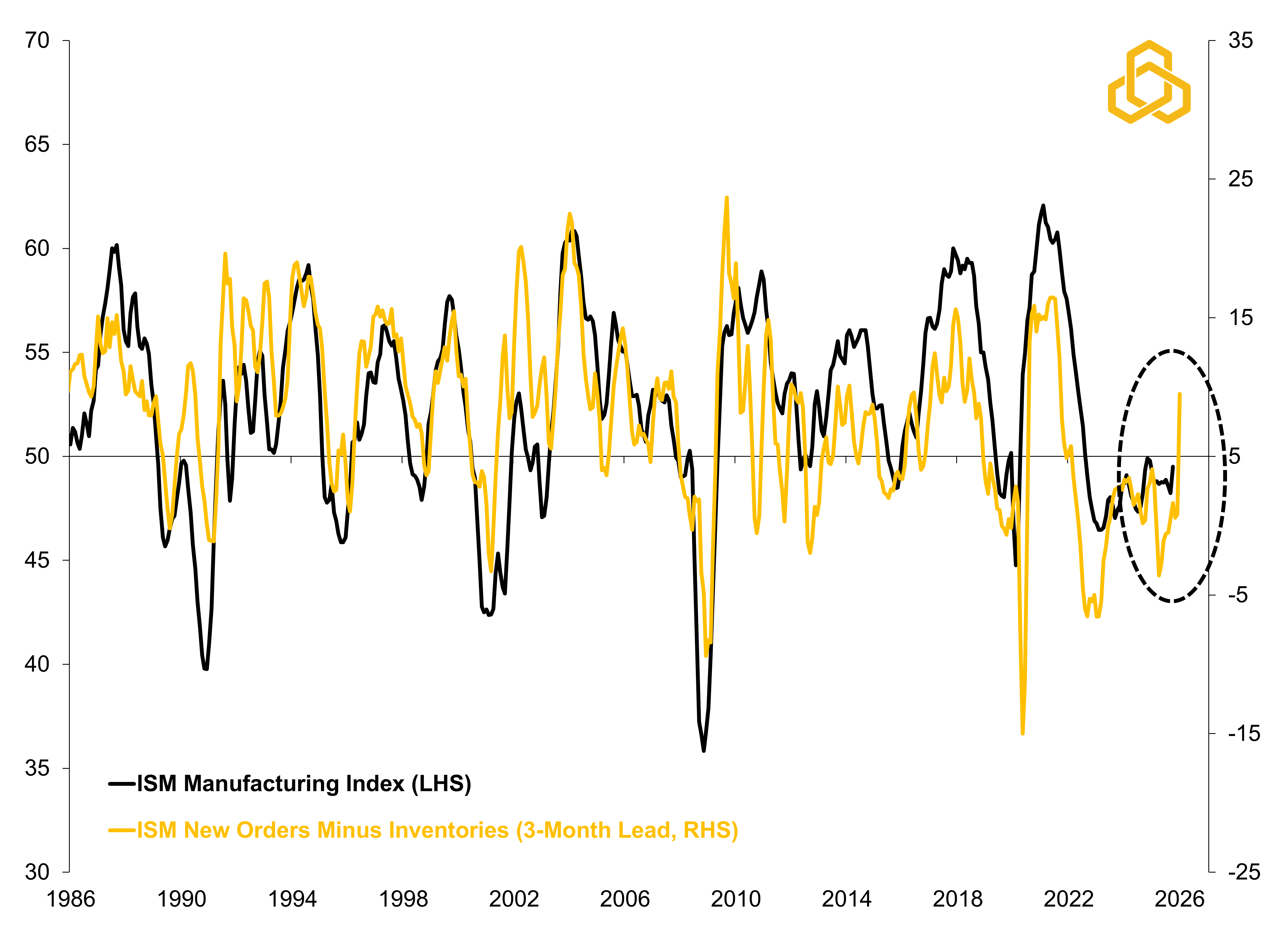 Sources: Institute for Supply Management and Potomac. Data as of January 2026. Note: A reading of above 50 on ISM new orders means that orders are thought to be expanding; below means contracting.