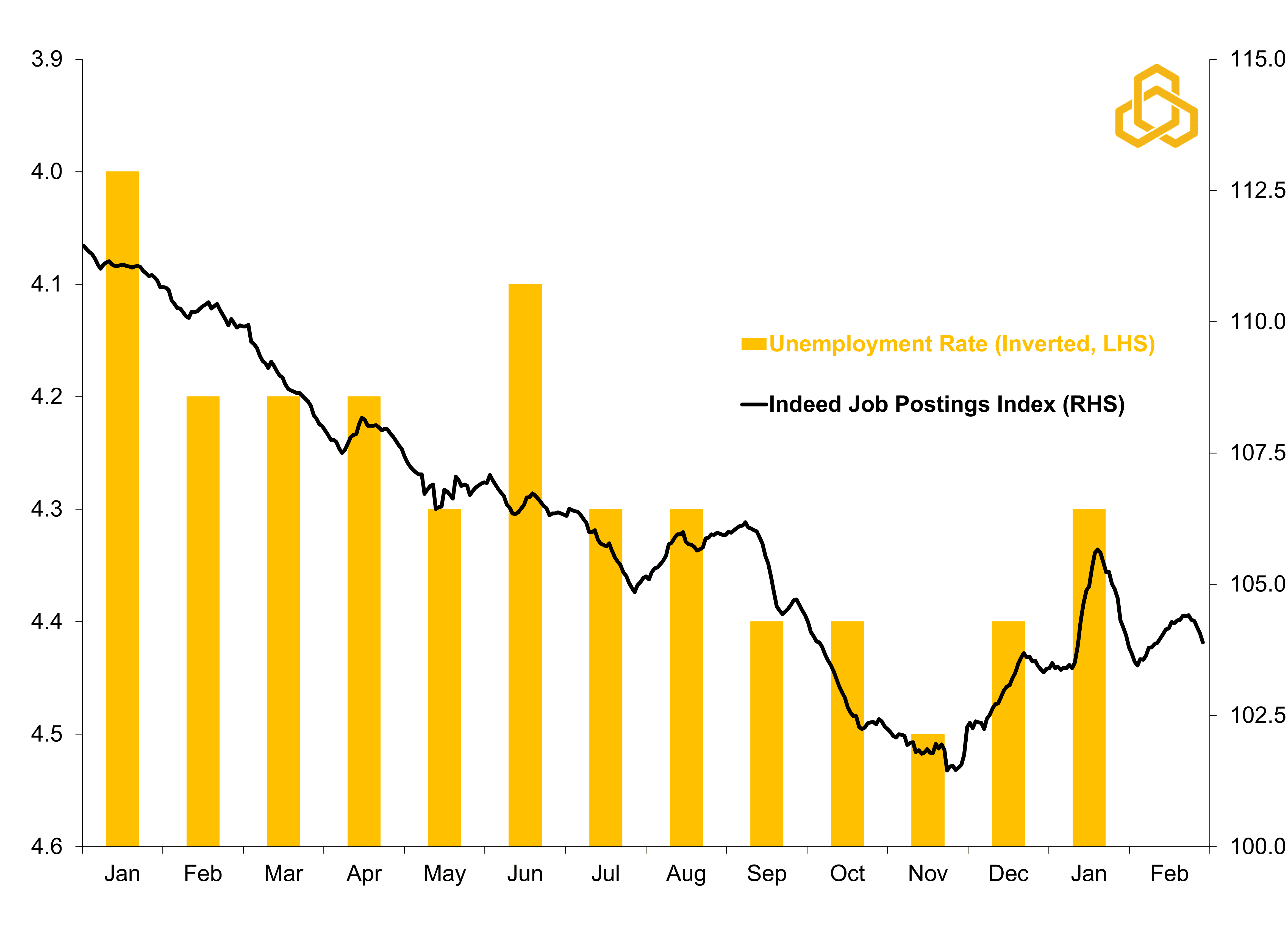 Sources: Bureau of Labor Statistics, Indeed.com, Bloomberg, L.P., and Potomac. Data as of January 2026 for the unemployment rate; January 31, 2026 for job postings.