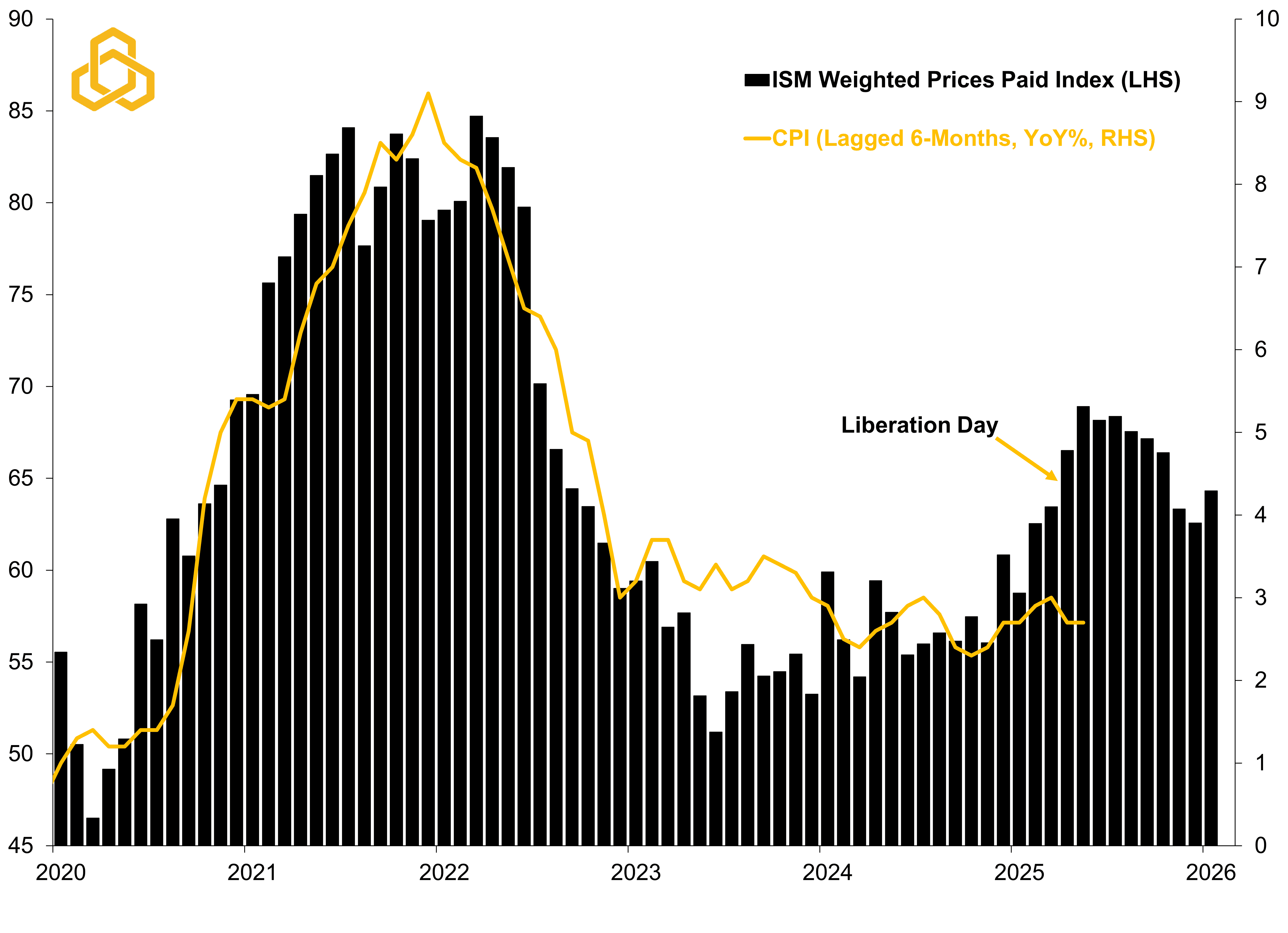 Furthermore, "prices paid" for inputs are trending lower. This suggests that the initial shock of the Liberation Day tariffs (April 2025) may gradually fade (see figure 4). As these lower costs move through the supply chain alongside cooling home prices, we should see inflation moderate further in 2026. This shift is likely to give a Kevin Warsh-led Fed (see last week’s note) the "green light" to cut rates at least once or twice more this year.