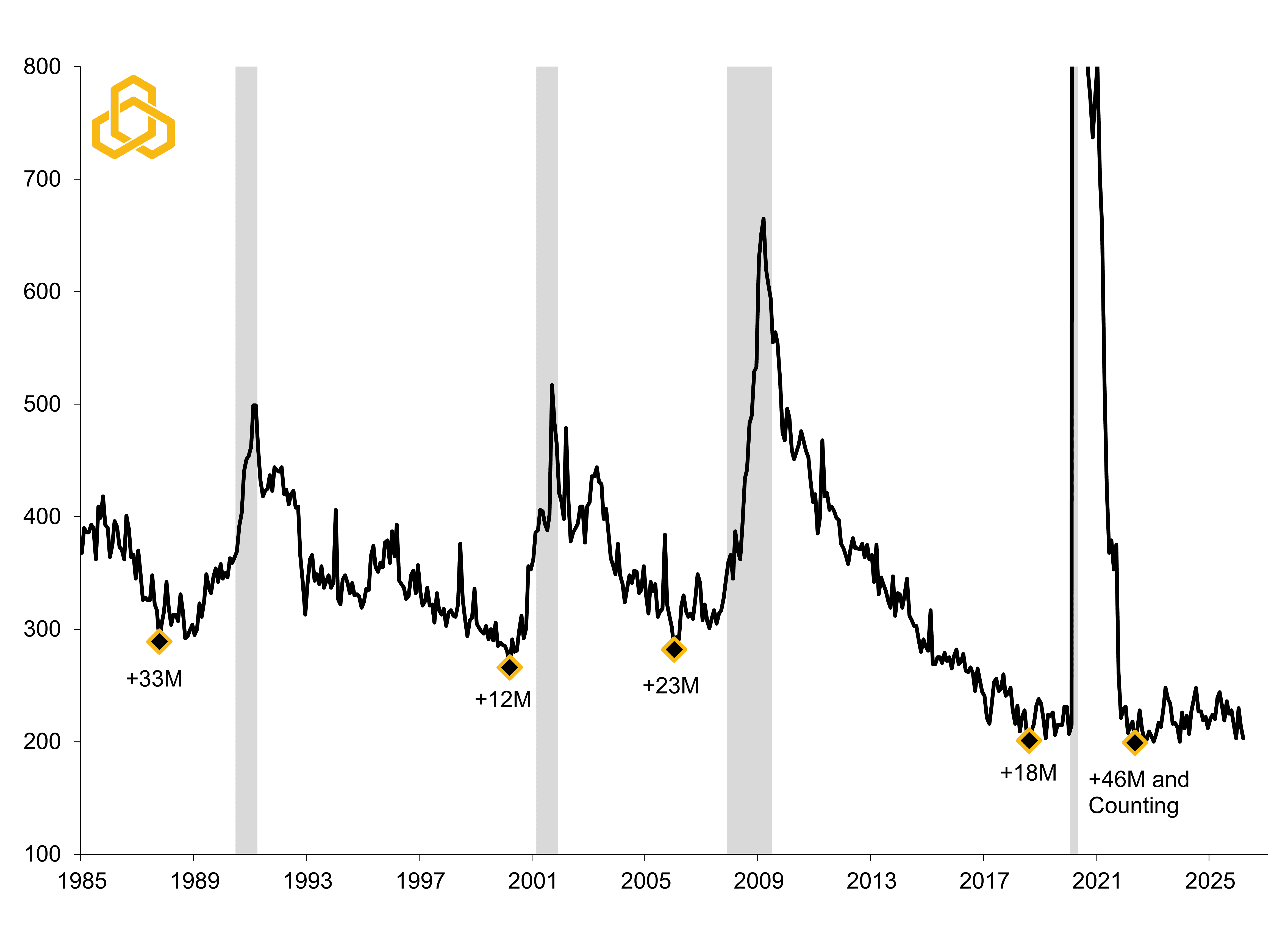 Currently, claims appear to have bottomed roughly 46 months ago, which coincides with the start of the Fed’s 2022 rate hiking cycle. Yet despite tighter policy, layoffs remain limited. If corporate profitability holds up, this “low-hire, low-fire” environment will probably persist for some time.