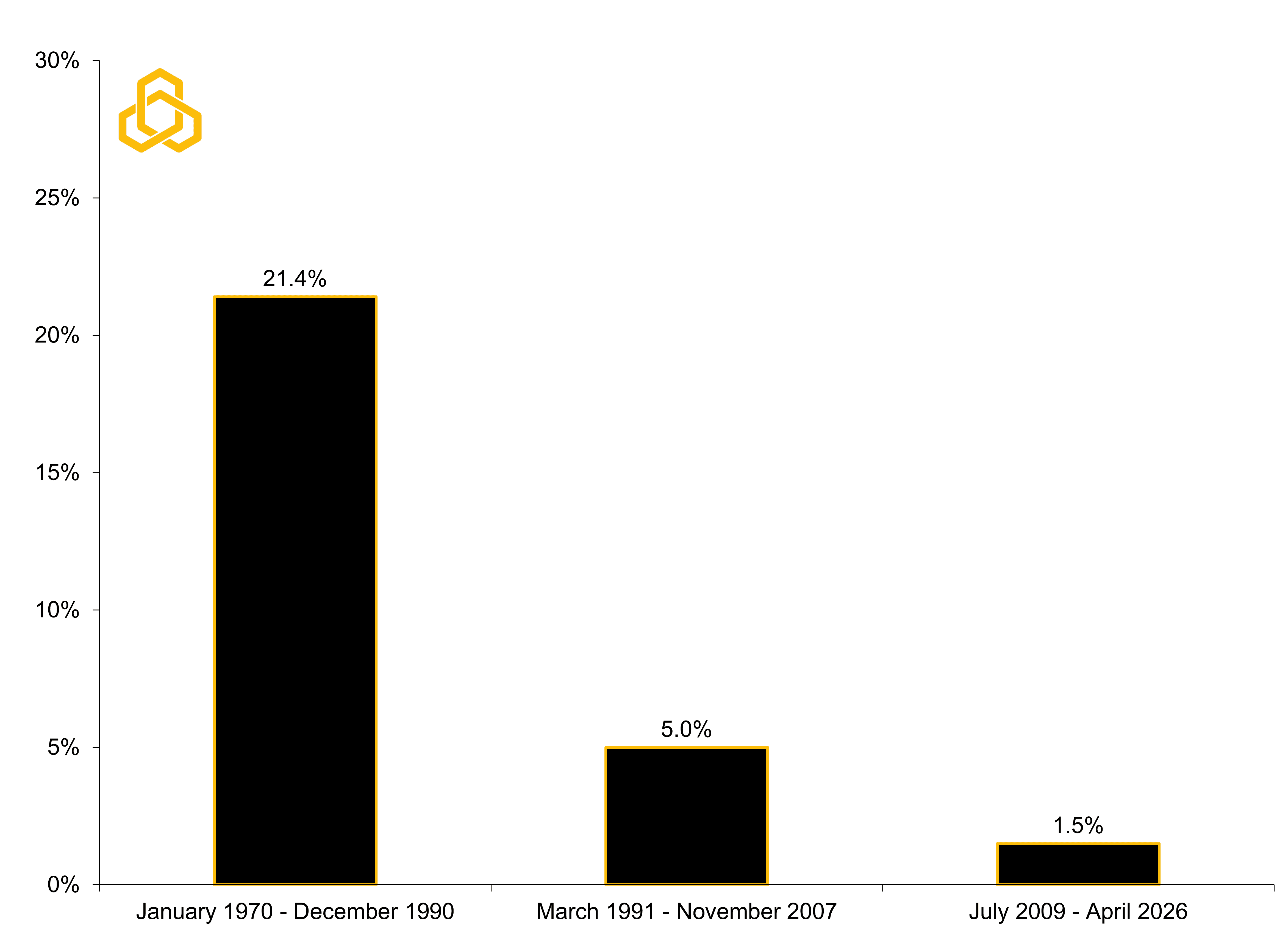 While the media tends to amplify recession fears, the data tell a very different story. The frequency of recessions has declined steadily over the past half century. Since 1970, the U.S. economy has gone from being in recession roughly 21% of the time between 1970 and 1990 to just 1.5% of the time following the Global Financial Crisis (see figure 2).