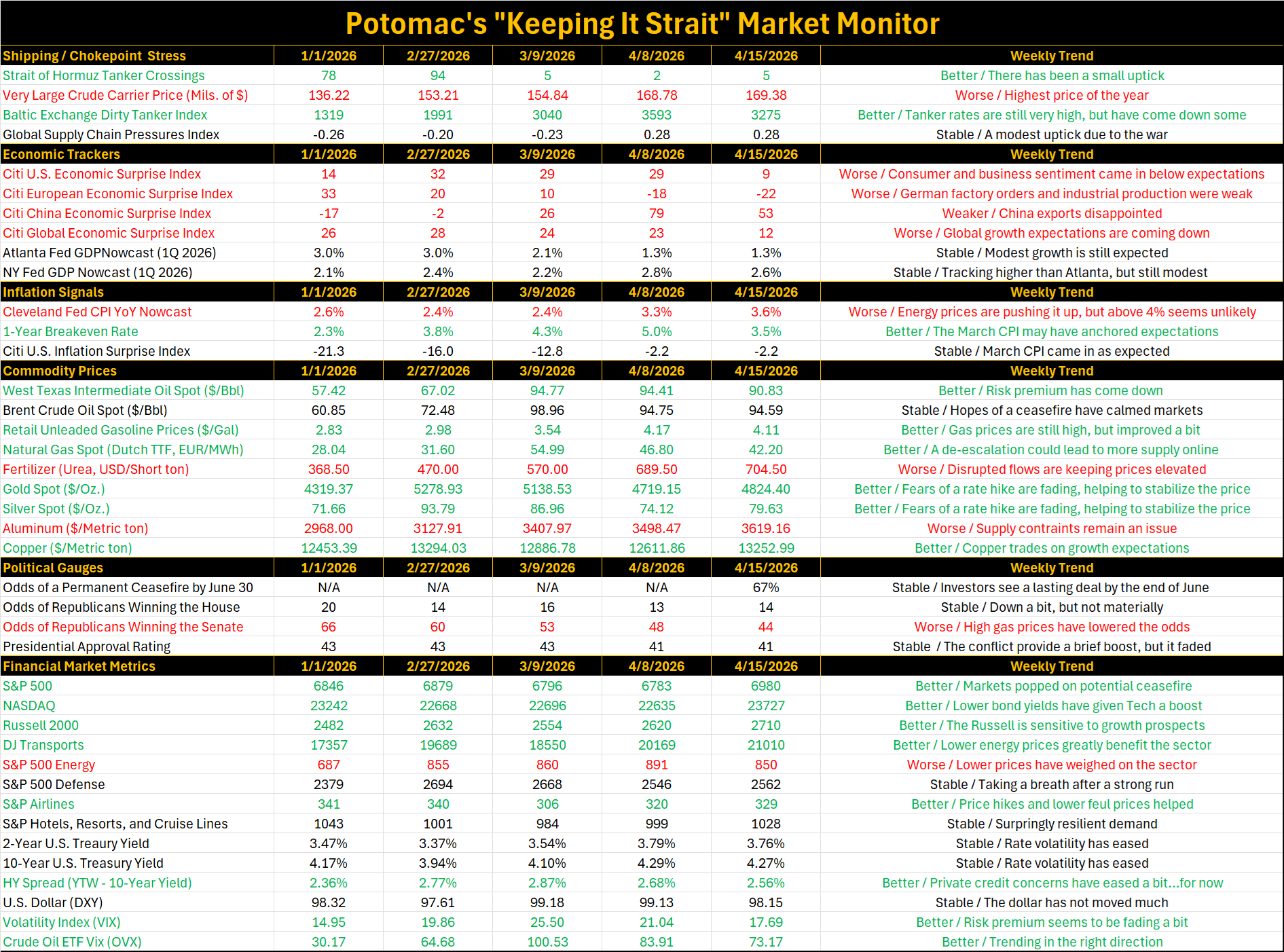 Source: Bloomberg L.P. and Potomac. Data as of April 15, 2026. Note 1: The dates selected are 2/27/2026 (start of the conflict), 3/9/2026 (initial oil surge/peak as the Strait closed), and the latest week and previous week to compare the weekly trend. Note 2: Economic and inflation surprise index readings about zero imply that data are beating the consensus on average, below zero means that data are missing expectations. Note 3: In commodity prices, we ranked higher oil, natural gas, retail gas, fertilizer, and aluminum prices as bad for the economy because it weighs on growth, we ranked rising gold and silver prices are good due to the investor perspective. Note 4: Political betting market odds are forecasts. All forecasts are expressions of opinions and are subject to change without notice and are not intended to be a guarantee.
