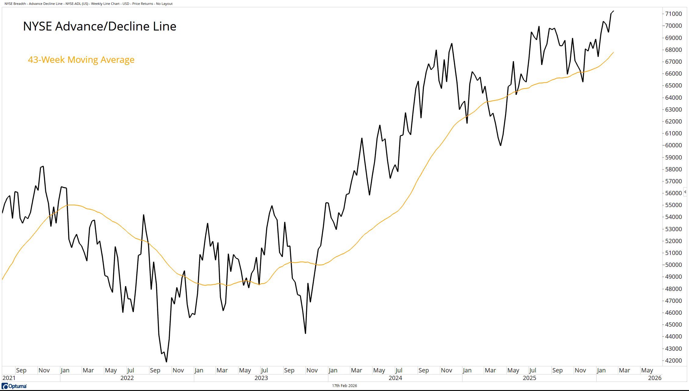 As the major averages consolidate, more stocks continue to move higher than lower. The NYSE Advance/Decline Line made a new high last week and remains above its rising 43‑week moving average.