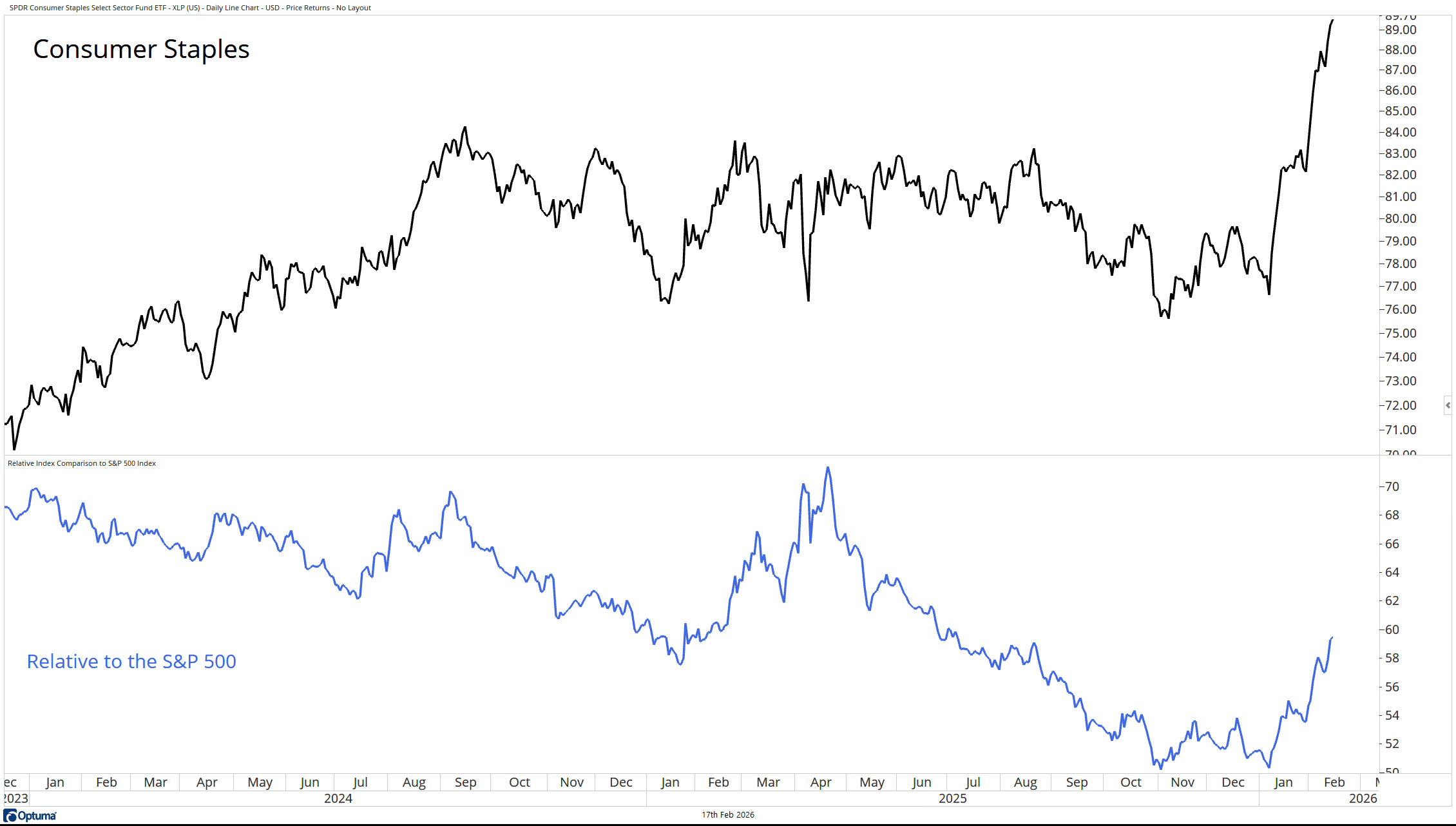 All of this is unfolding as investors continue to rotate into Consumer Staples—a historically defensive corner of the equity market. The group has broken out to new highs and has turned higher on a relative basis versus the S&P 500.