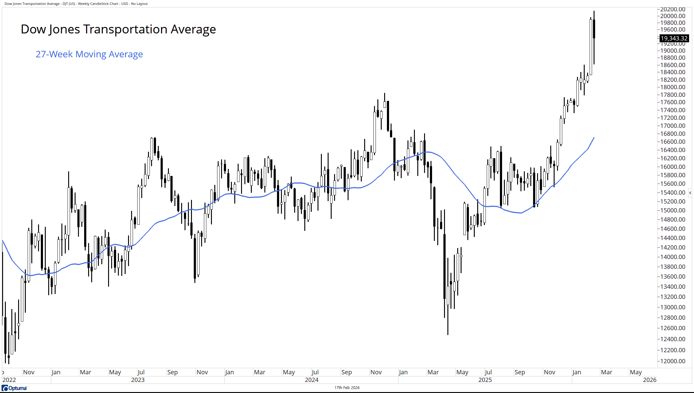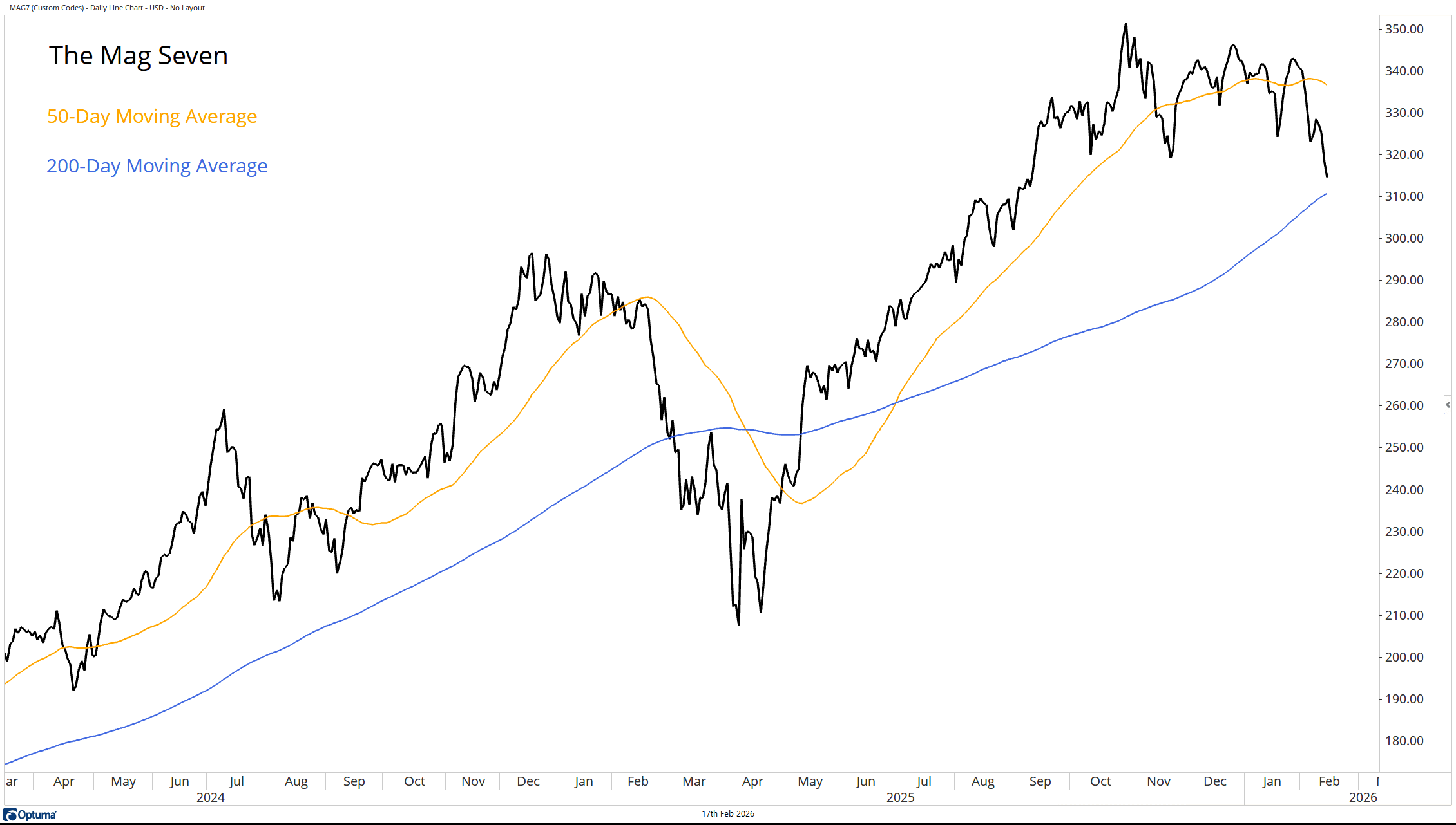 The market’s heaviest weights are now under pressure. An equal‑weight index of the Mag Seven shows that, at a minimum, the intermediate‑term trend has shifted from up to flat. The group is trading below a now‑declining 50‑day moving average and is approaching its 200‑day moving average.