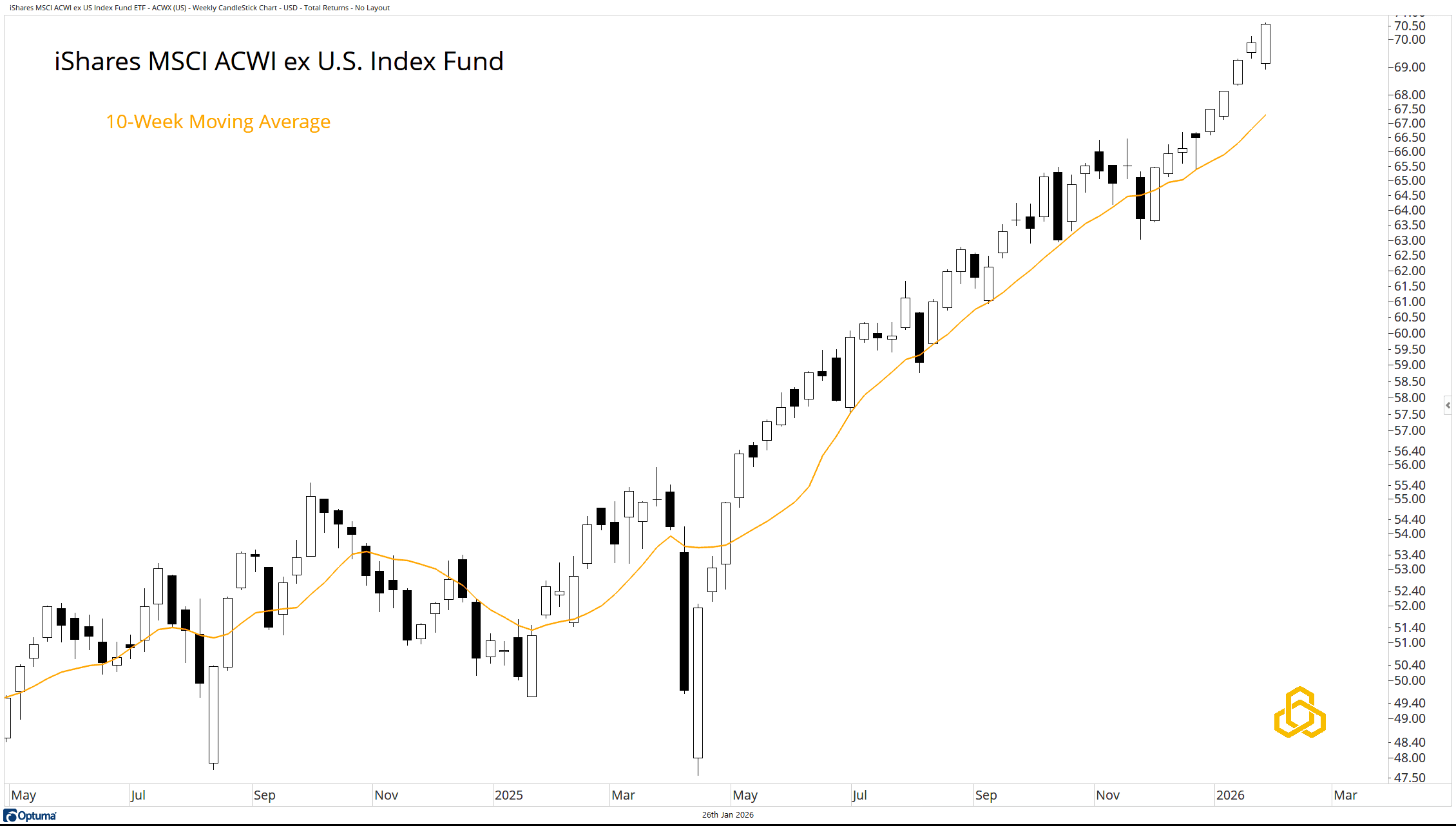 It’s possible that investors are simply reallocating capital outside the U.S. The iShares MSCI ACWI ex U.S. Index Fund closed higher for a ninth consecutive week and continues to trade well above its rising 10-week moving average.