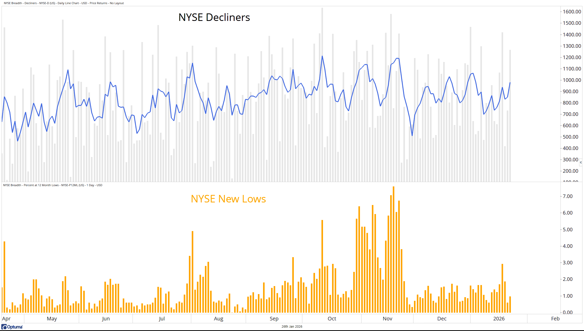 The S&P 500 closed lower for a second consecutive week, while the NASDAQ 100 remains in the consolidation zone we’ve been highlighting here. There has been a small uptick in new lows on the NYSE over the past week. At the same time, the five-day moving average of decliners on the NYSE has reached its highest level of 2026.