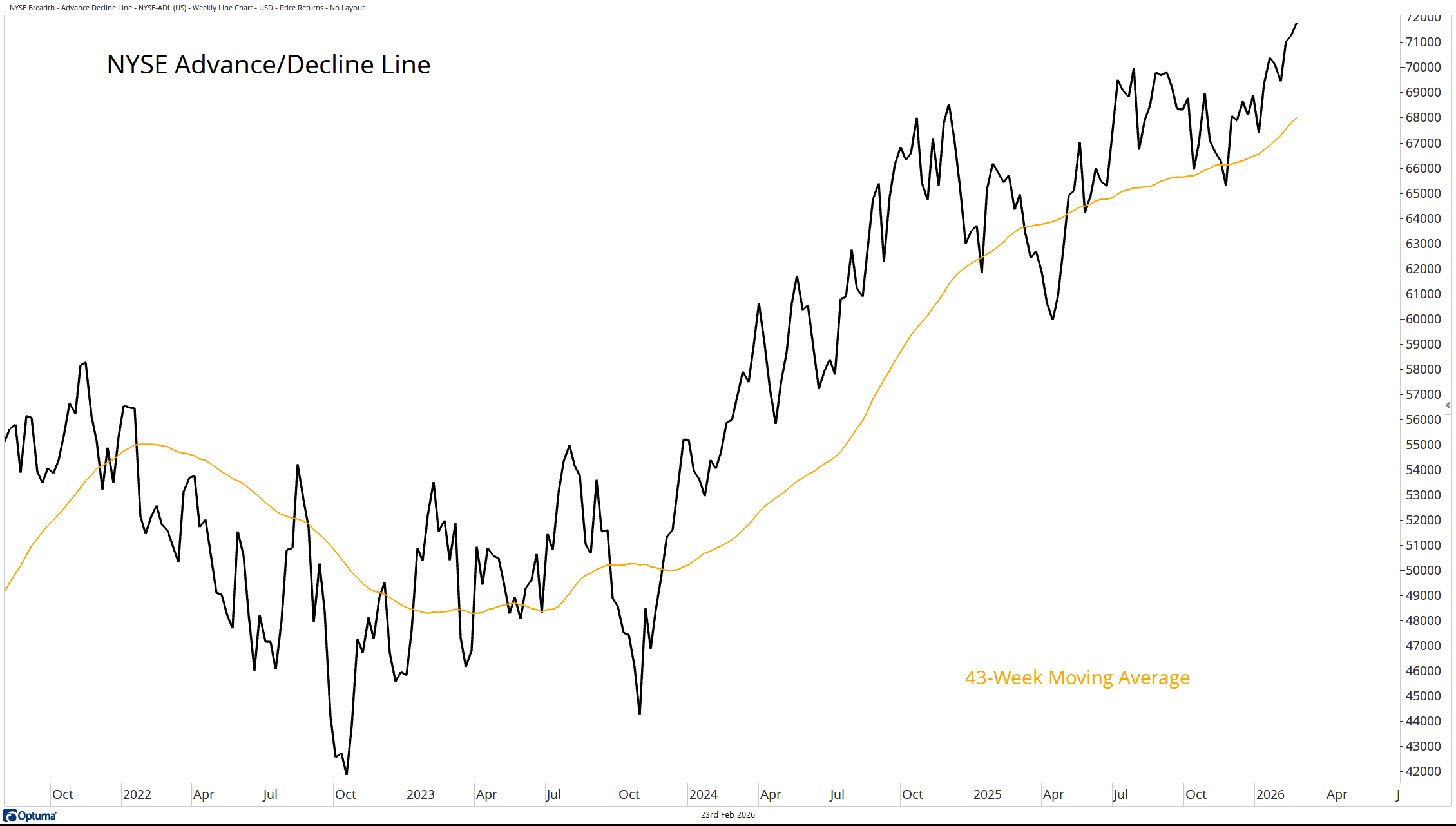 Breadth bulls can, and should, point to the NYSE Advance/Decline Line breaking out to new highs above its rising 43-week moving average. A lot of stocks are going up, and that matters. That’s bullish.
