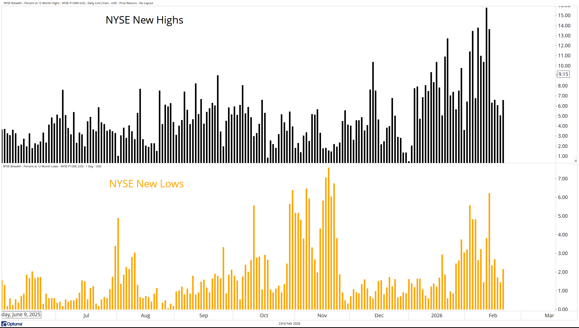 Here’s where nuance comes in. New highs on the NYSE remain healthy, which is bullish. At the same time, we’ve noted an uptick in new lows, which is not.