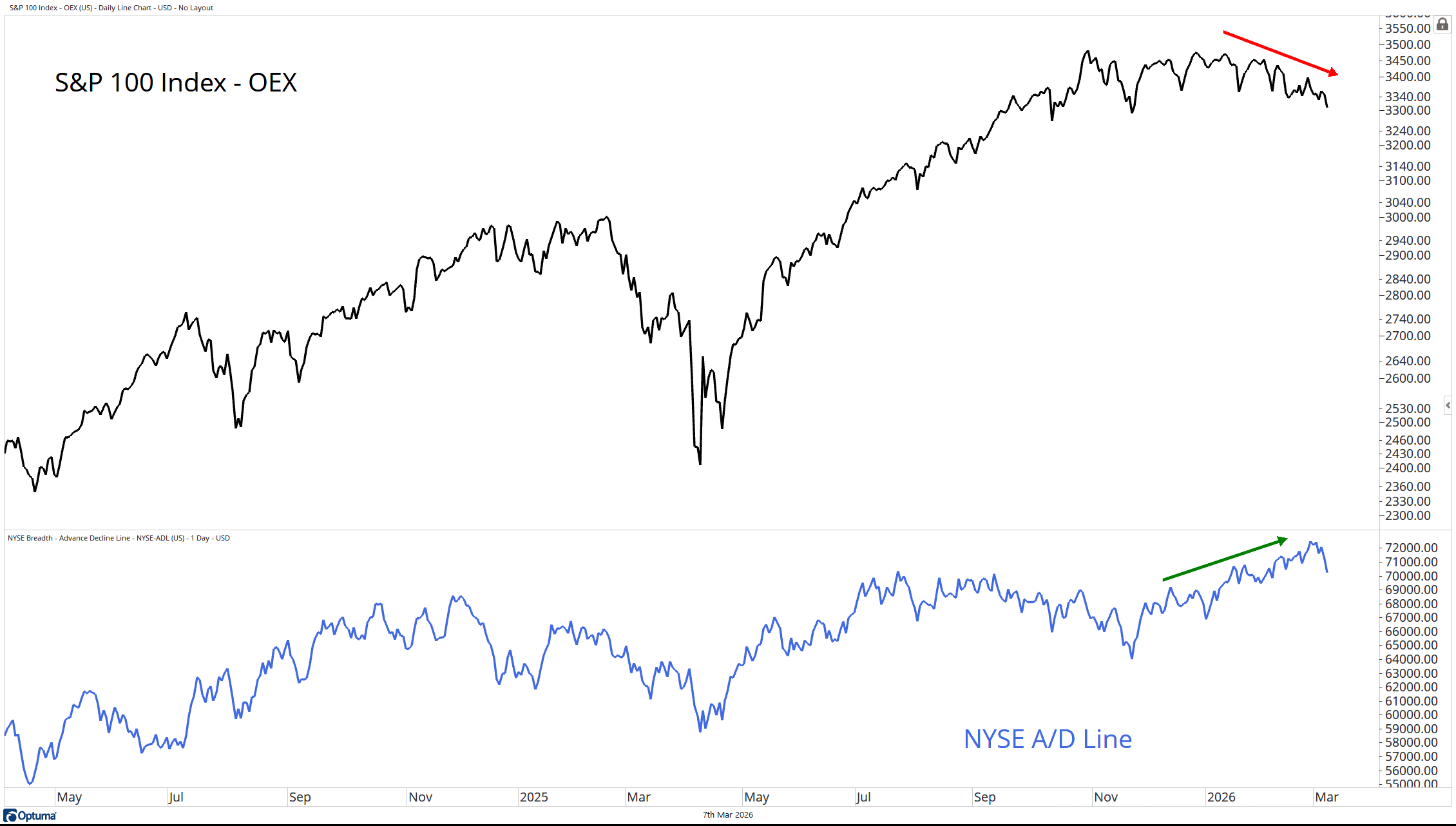 But pressure is exactly what the market is beginning to feel. For weeks, we’ve highlighted that megacap stocks have been making it difficult for the market to move higher, even as the “rest of the market” has been doing just fine.