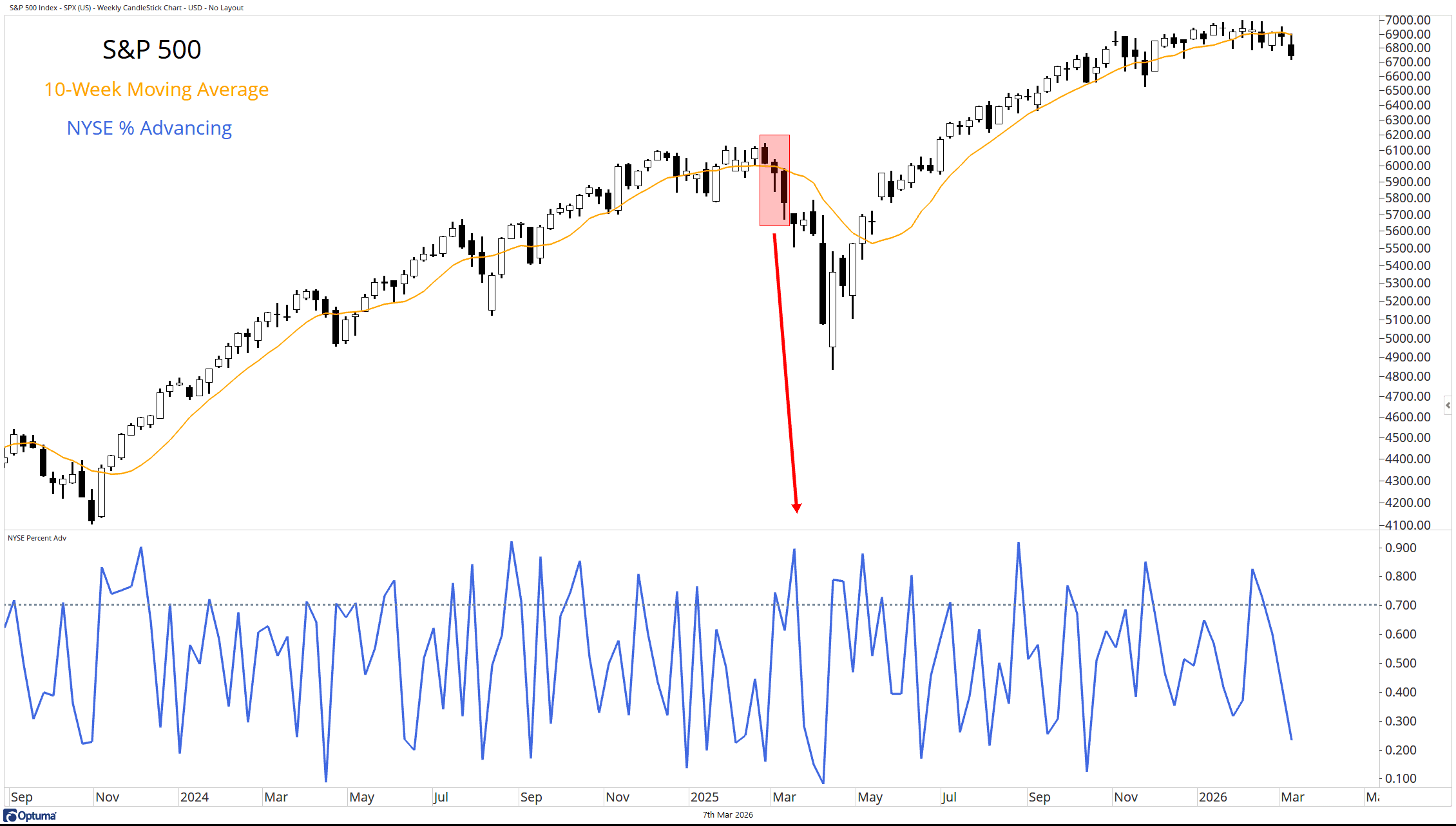 At the same time, the percentage of advancing stocks on the NYSE fell sharply last week, echoing the dynamic we saw in March of last year.