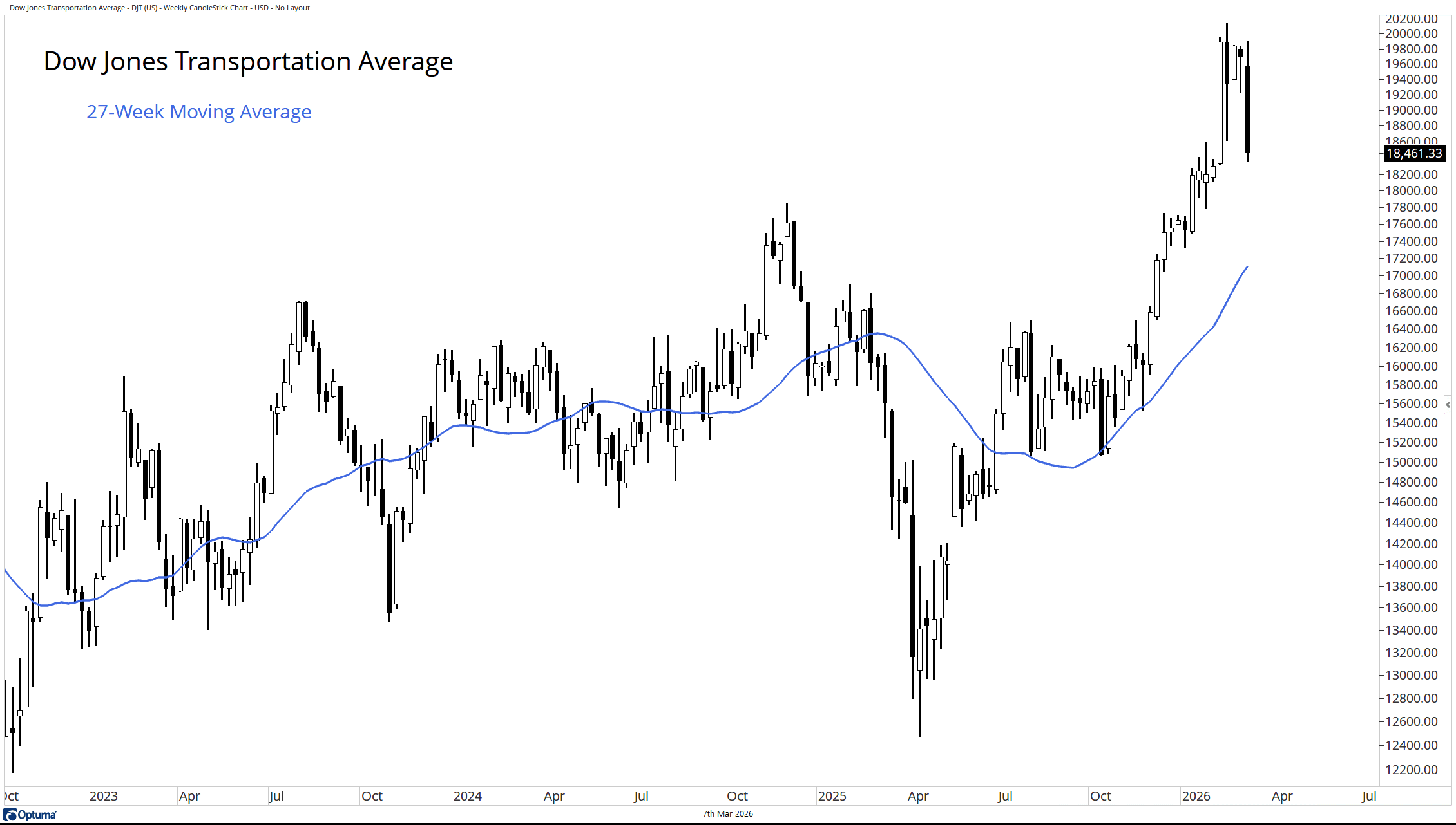Meanwhile, the Dow Jones Transportation Average came under pressure last week as well. While the index remains well above its rising 27-week moving average, last week’s action may have been an early warning that this key level is now coming into play.
