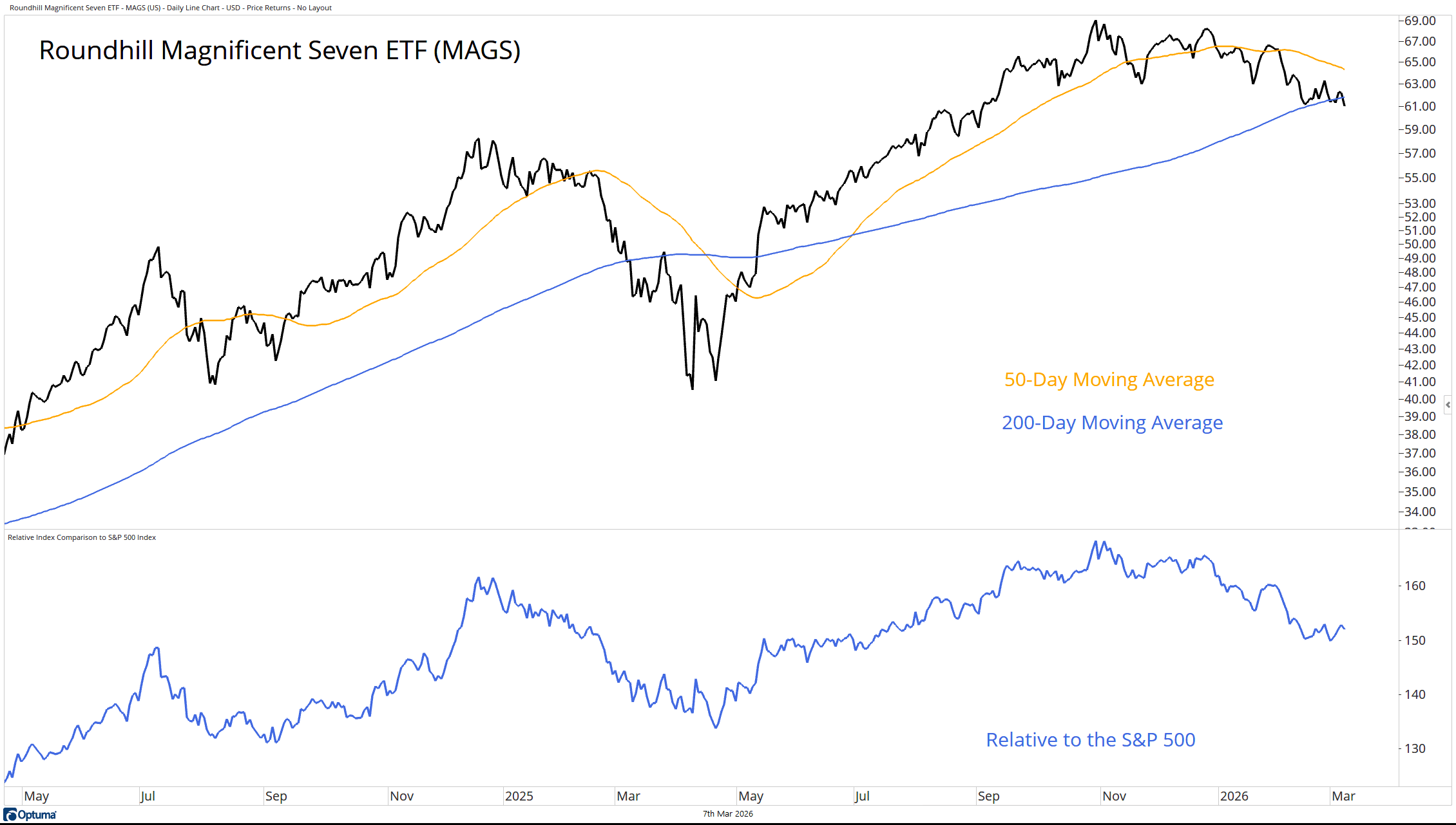 Speaking of new lows for the year, the Roundhill Magnificent Seven ETF (MAGS) has joined the list. The fund now sits below both its 50 and 200-day moving averages and is in a clear downtrend relative to the S&P 500.