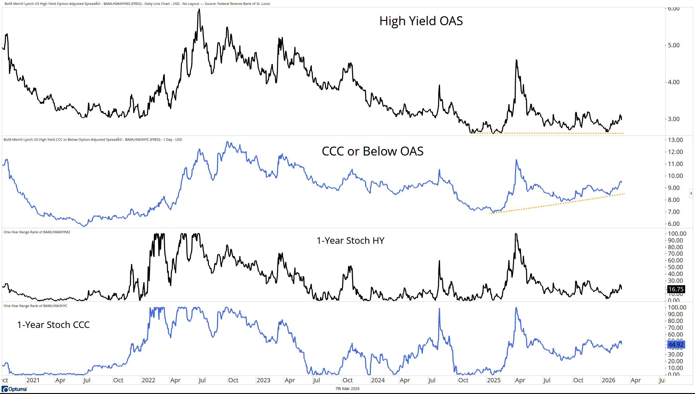 In traditional high-yield bonds, spreads remain relatively tight, with the one-year stochastic below 17%. But in CCC-rated and below credits, investors are demanding an increasingly larger premium. The one-year stochastic there is approaching 45%.