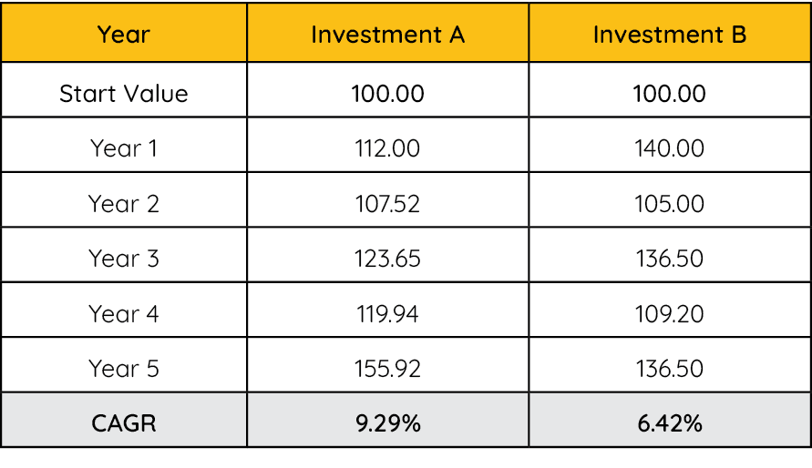 Because of lower volatility, investment A had a compound annual growth rate (CAGR) of 9.29% compared with just 6.42% for investment B.