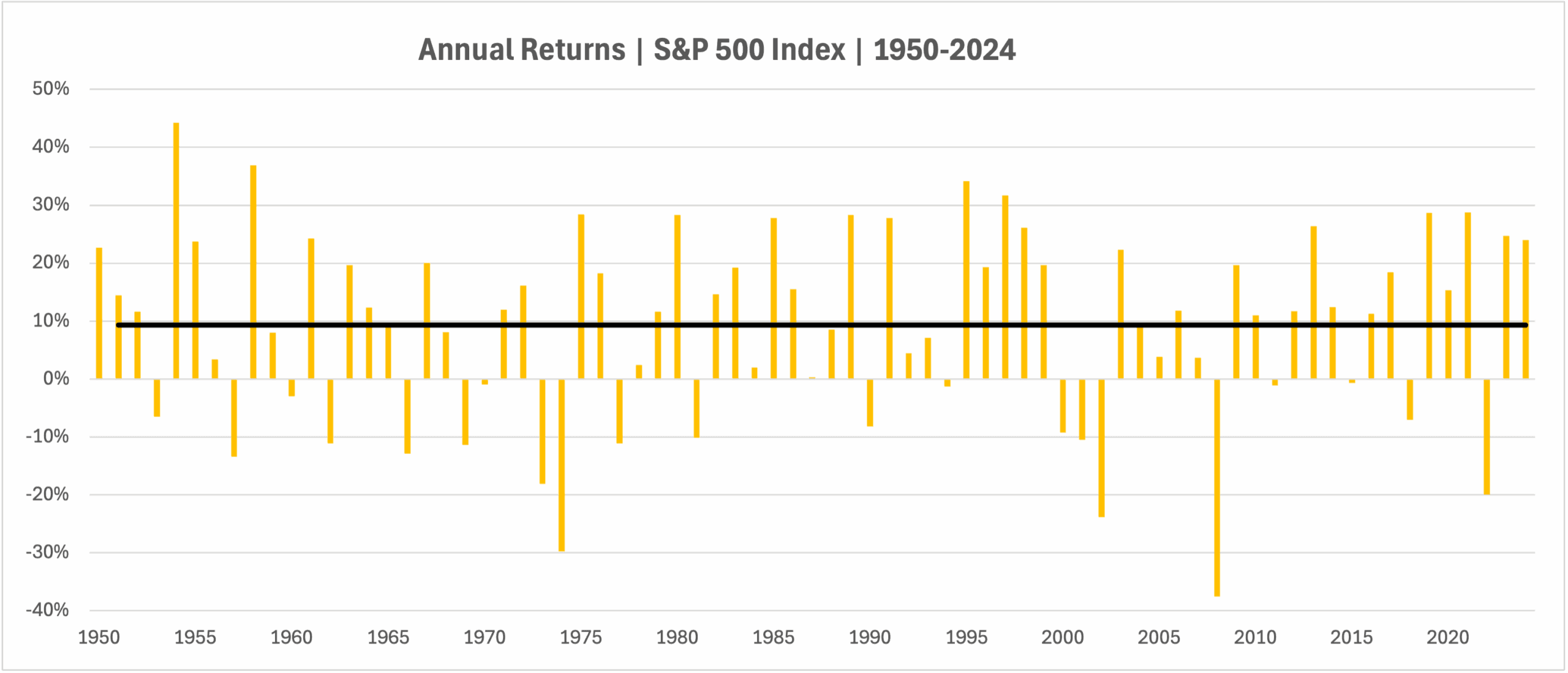 For example, from 1950 through 2024, the average annual return for the S&P 500 Price Index (S&P) was 9.31%. (S&P price return was used rather than total return in attempt to use the largest dataset).