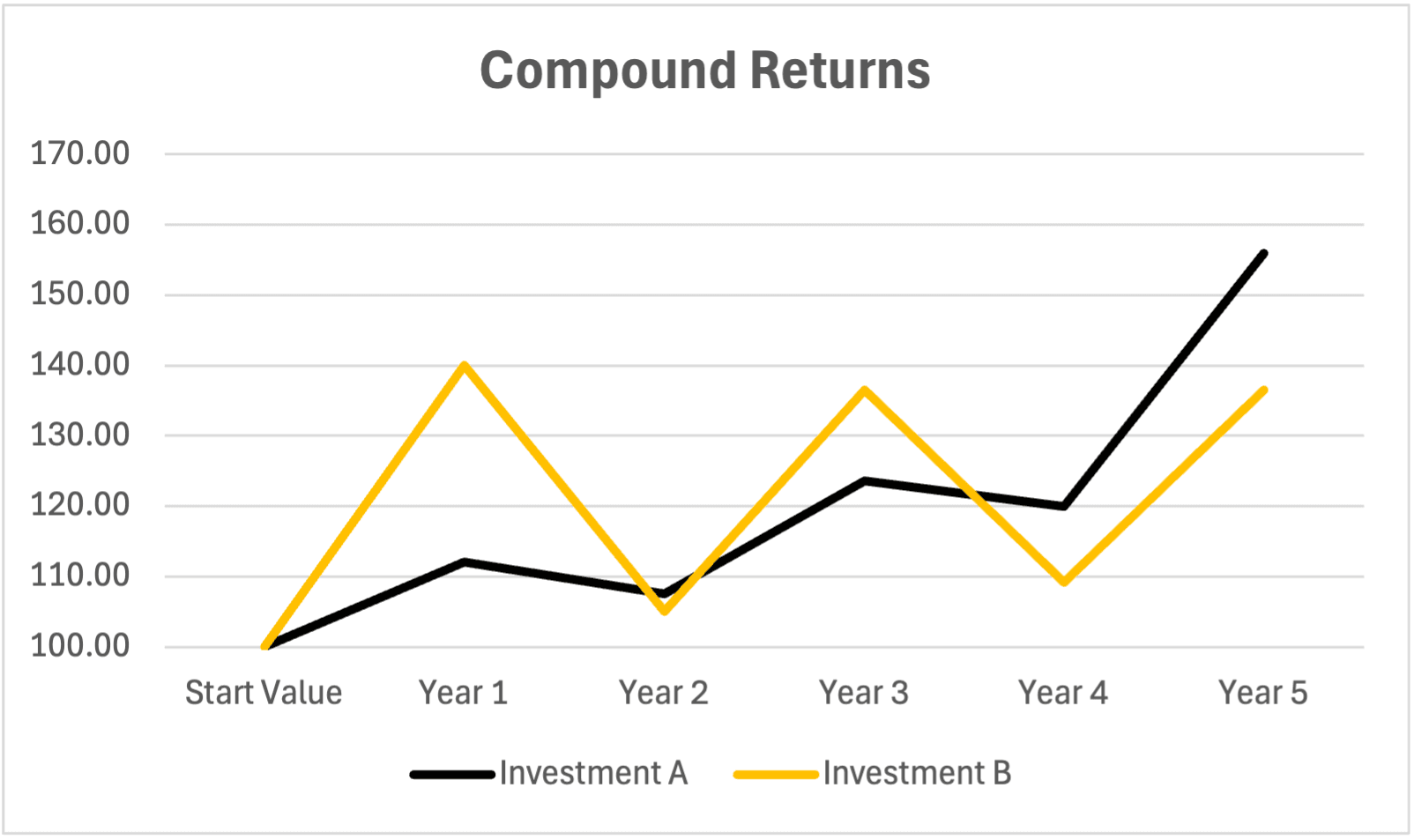 As shown below, by year five, investors in investment A are significantly better off than those in investment B because of compounding.