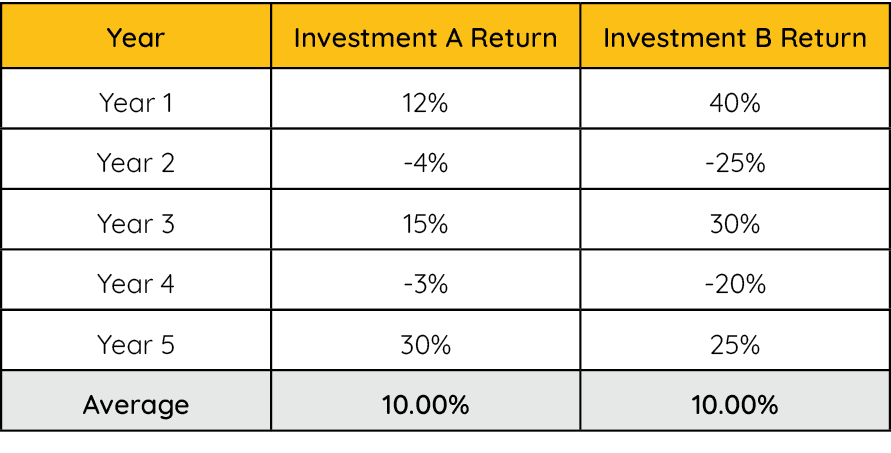 To illustrate, consider two hypothetical investments, A and B, both with an average annual return of 10%. However, Investment B is about twice as volatile as investment A.