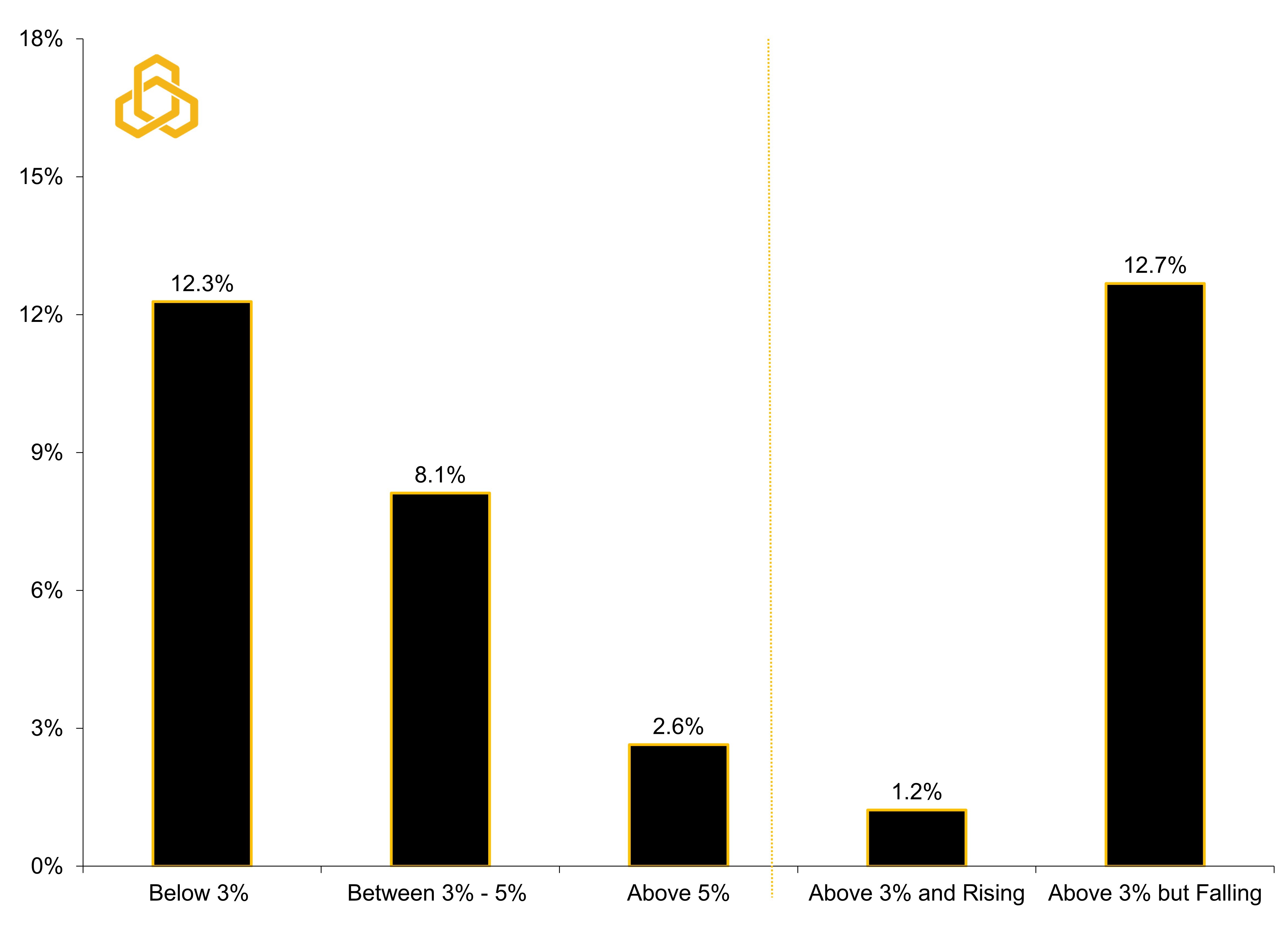 It is not the level of inflation that drives equity returns, but the direction of inflation and how monetary policy responds. When inflation rises above 3%, returns collapse to just over 1%, reflecting tightening financial conditions and the market pricing in a more aggressive Fed. In contrast, when inflation is still elevated but falling, returns rebound sharply to an average of 12.7%, roughly in line with low-inflation environments. In other words, stocks do not trade the level of inflation. They trade the change in inflation and the expected path of policy.